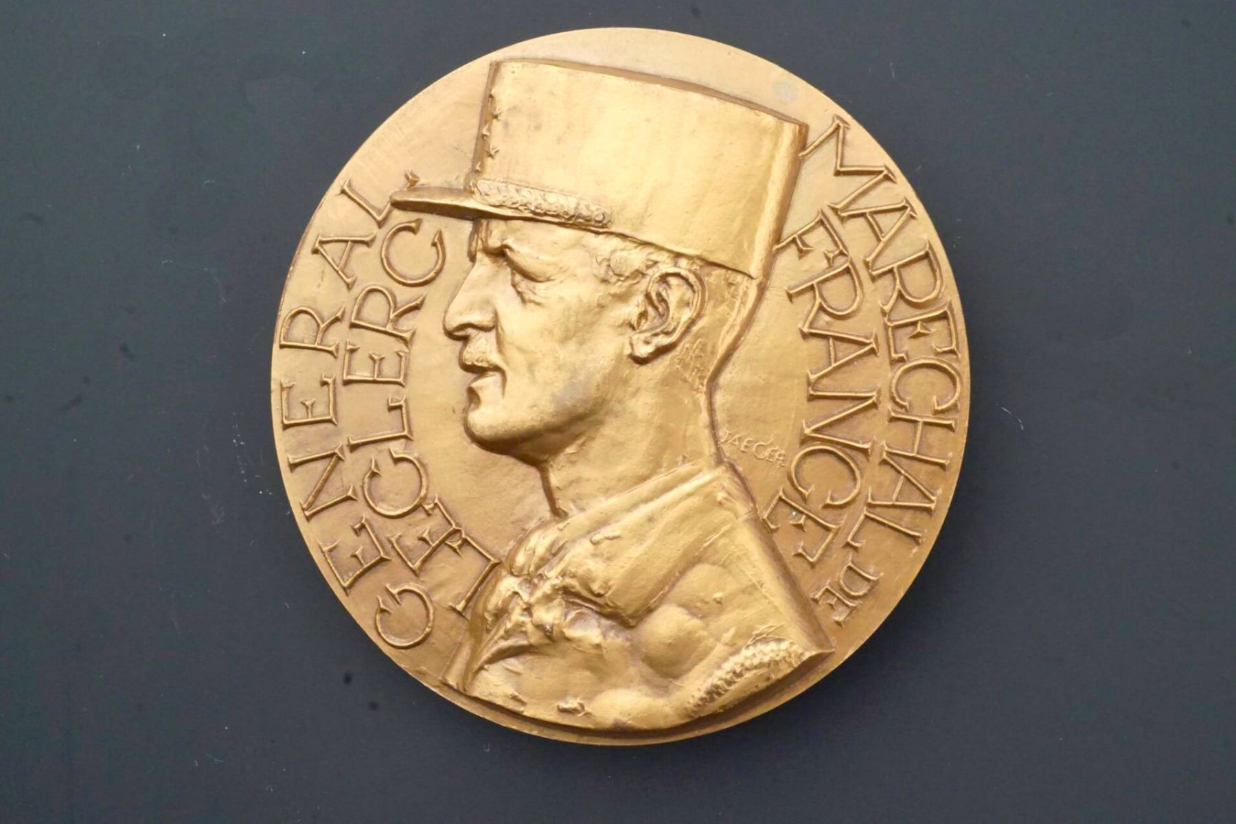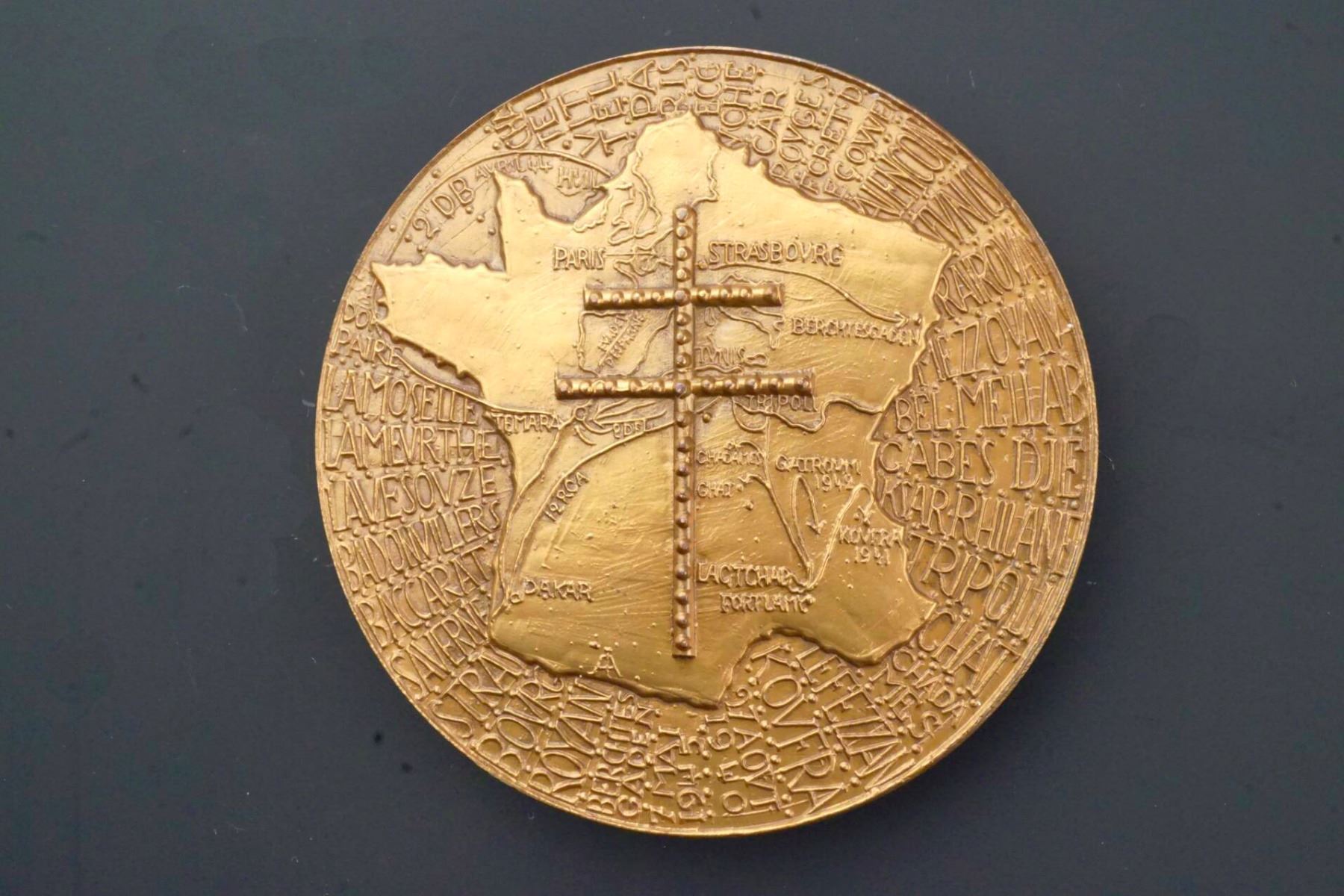 GENERAL LECLERC MARECHAL de France High relief bust, in military cap, left. Signed: JAEGER. Reverse: A central map of France, superimposed with the double cross, and with the fields engraved with names of the General's many campaigns. 65 mm, 180.9 grams.