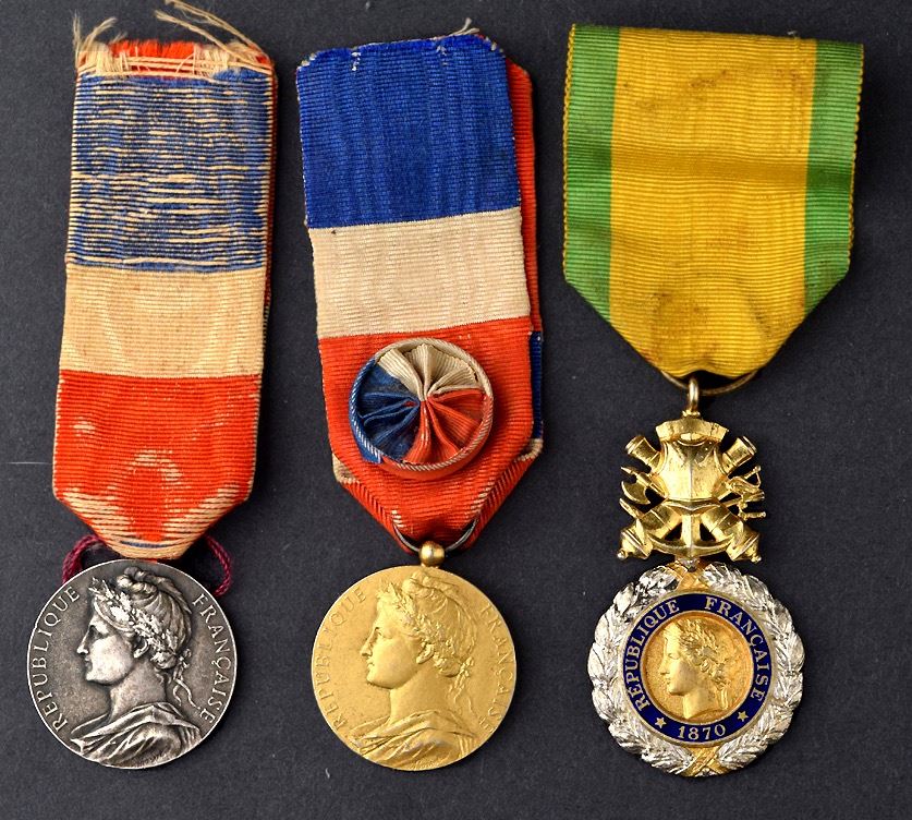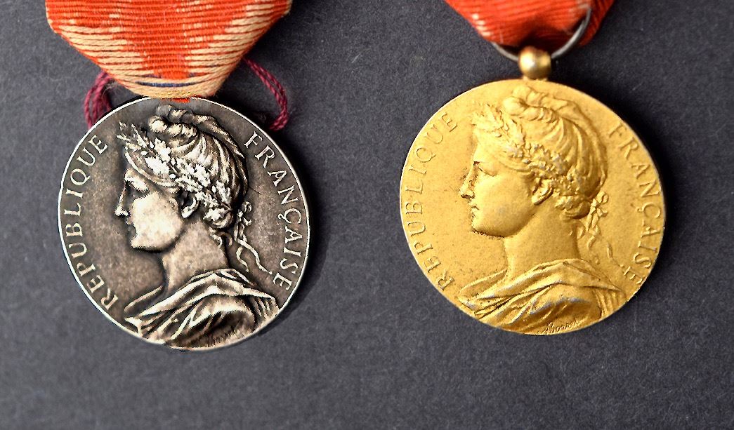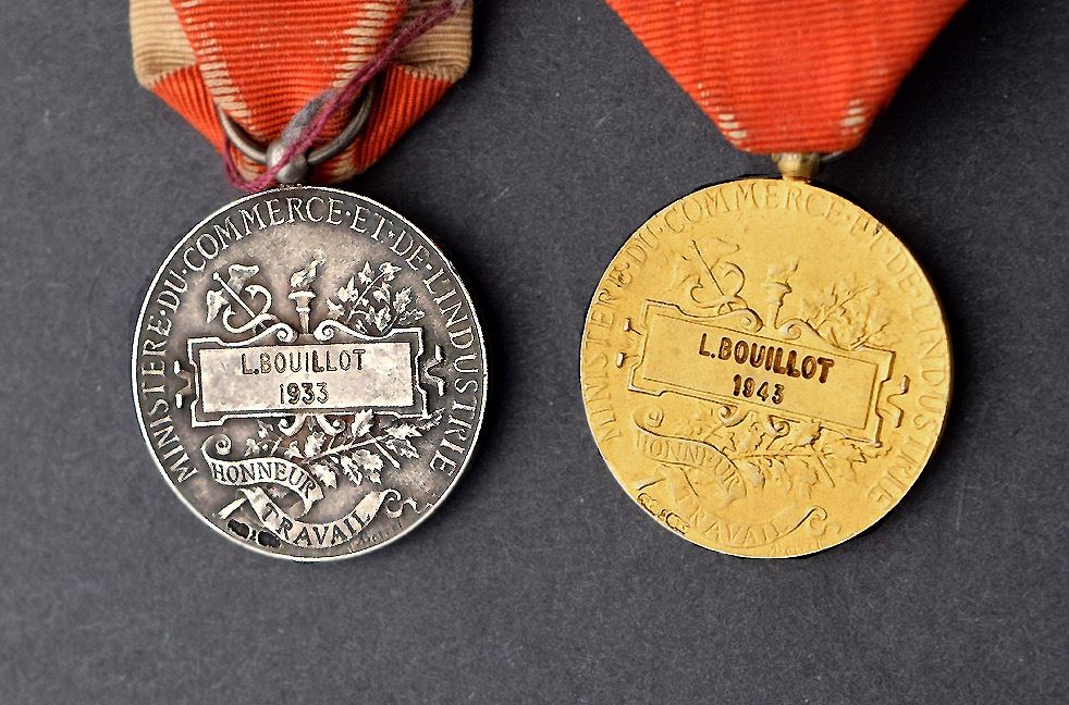 France medals : 2 medals from the Ministry of Commerce and Industry "Ministère de commerce et industrie - Honneur / Travail", named to L. Bouilleot 1933, but one is silver & the other is golden color. The third one is the type of Legion of Honor. All are in excellent condition with ribbon.