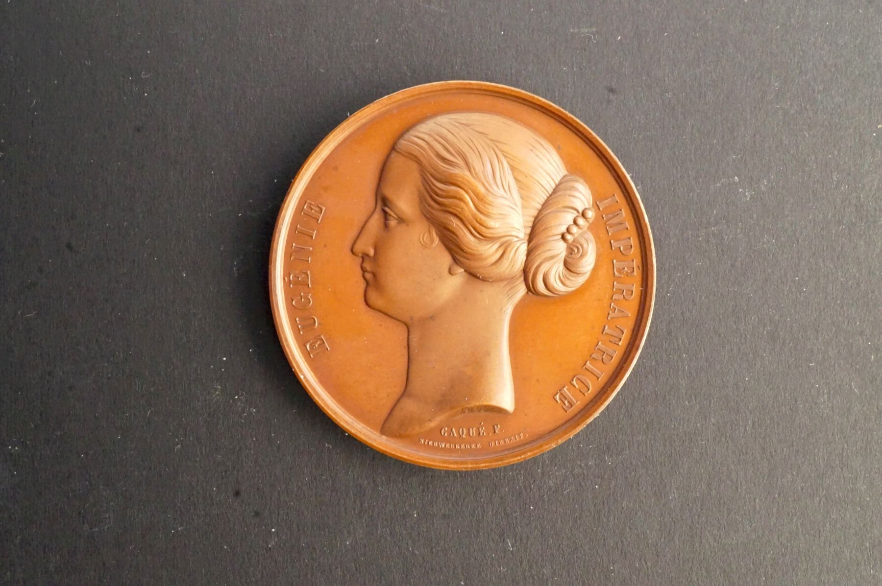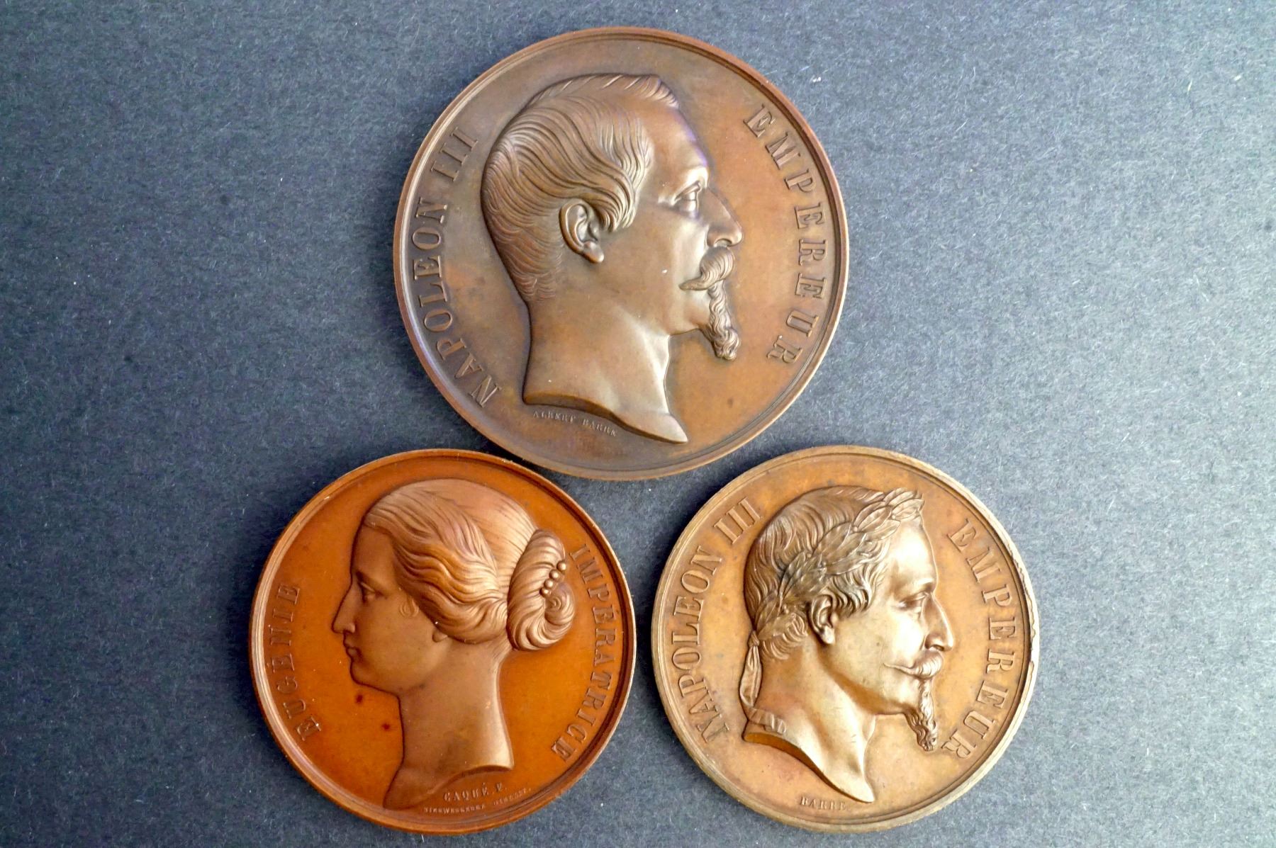 All have the Paris Mint CUIVRE mark on the edge, so may possibly be restrikes. 1) Obverse:NAPOLEON III EMPEREUR Bare head, left.Signed: CAQUÉ. F / E. DE NIEUWERKERKE DIREXIT EUGENIE IMPERATRICE Bust left. Same signature Condition is a glossy proof-like, 50 mm, 68.5 grams. 2) Obverse: NAPOLEON III EMPEREUR Signed: ALBERT BARRE. Reverse:EXPOSITION UNIVERSELLE AGRICULTURE INDUSTRIE BEAUX-ARTS PARIS 1865, Imperial arms at center, city shields around. 60 mm, 117.2 grams. 3) Obverse: NAPOLEON III EMPEREUR Laureate bust, right. Signed: BARRE. Reverse:MINISTÈRE DE L"AGRICULTURE DU COMMERCE ET DES TRAVAUX PUBLIQUES / wreath / Concours Agricole Regional / Animaux Reproducteurs, In central circle: LAON / 1866, 50 mm, 58.5 grams