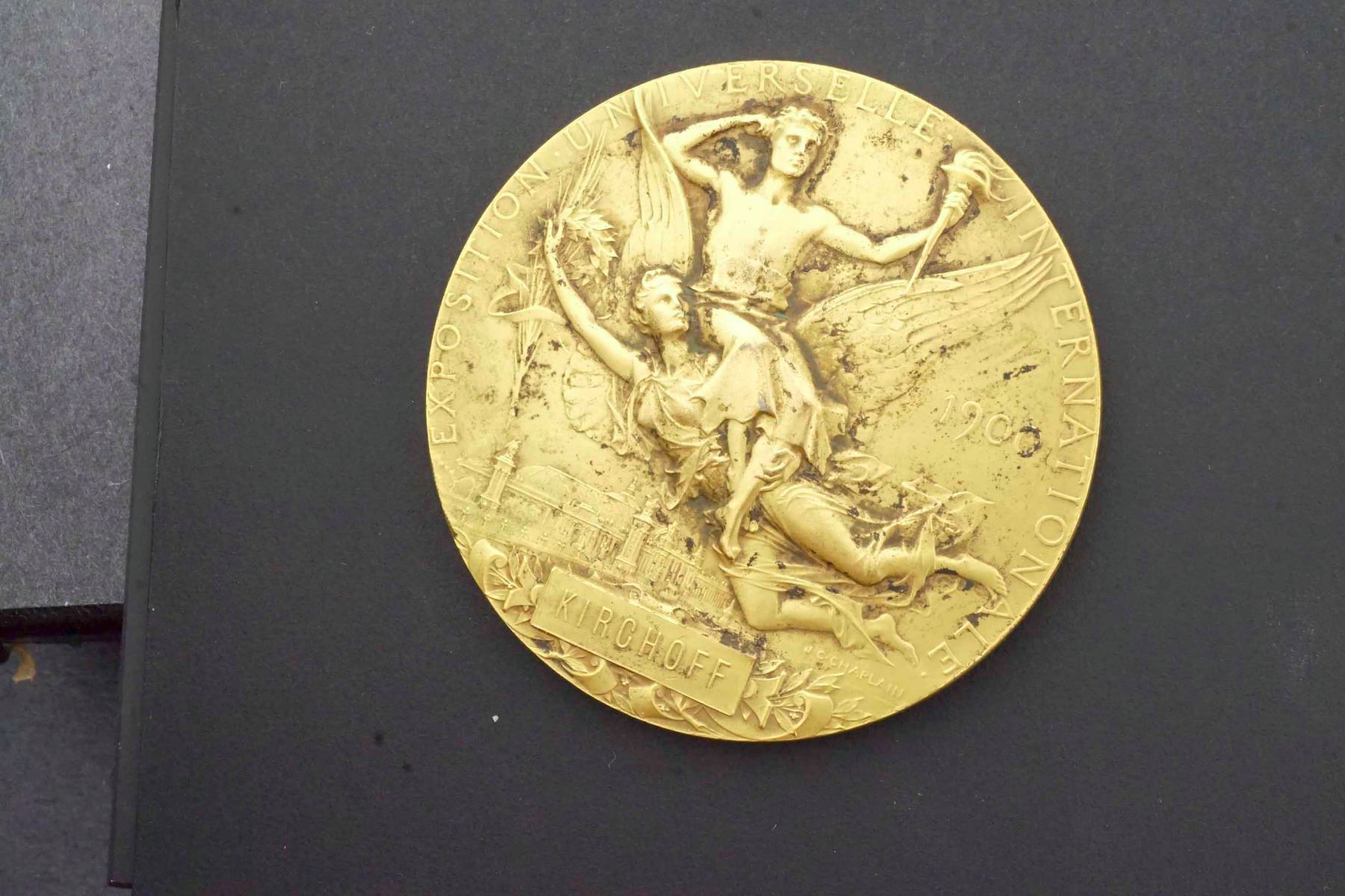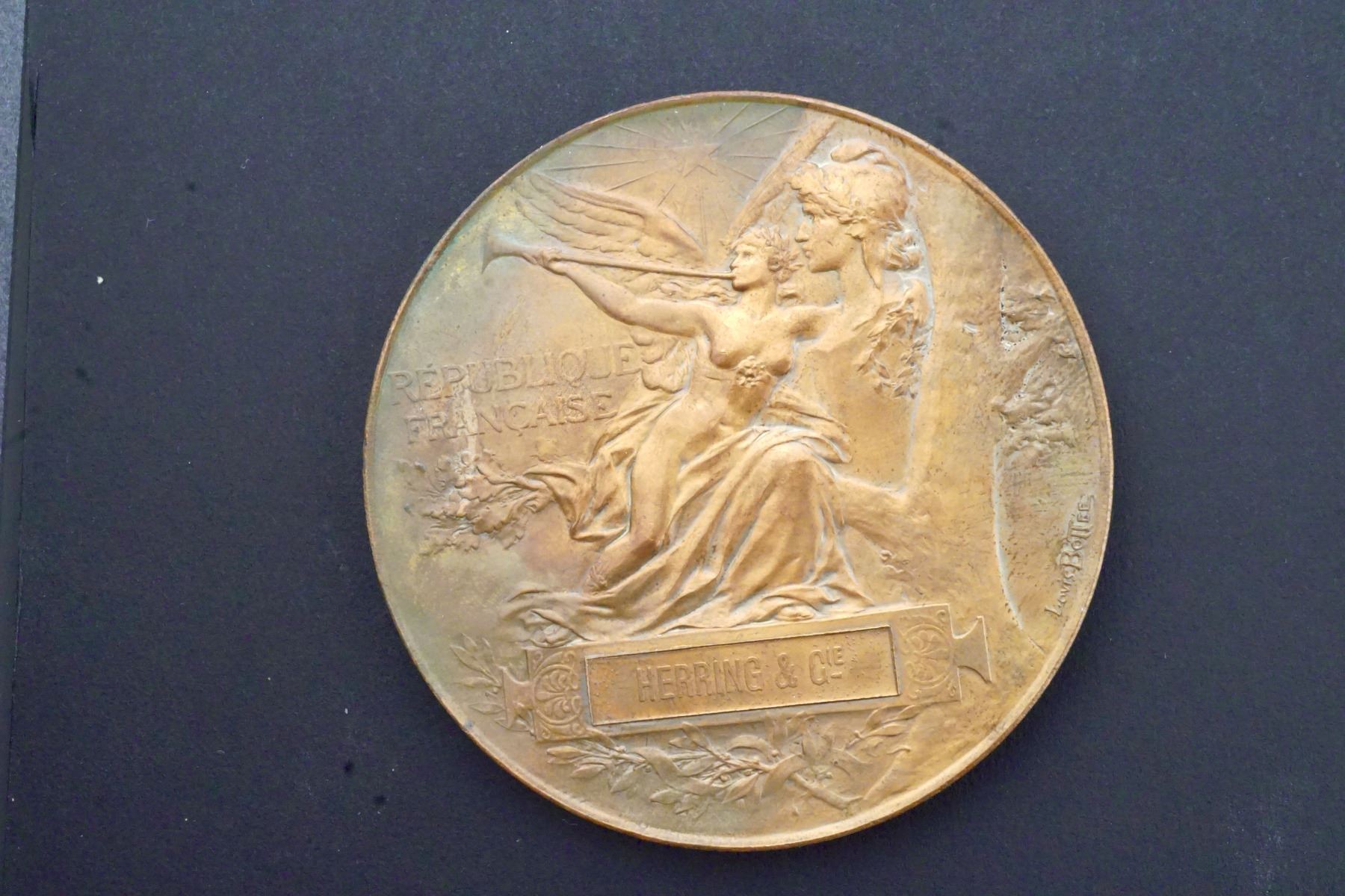 1) 1889. Signed Louis Bottée, Paris Mint BRONZE mark on edge, 62 mm, 101.6 grams. Company name in tablet is: HERRING & Cie. 2) 1900 Signed: J. C. CHAMPLAIN Paris, Mint BRONZE mark on edge. 63 mm, 100.6 grams. Company name in tablet is:KIRCHOFF