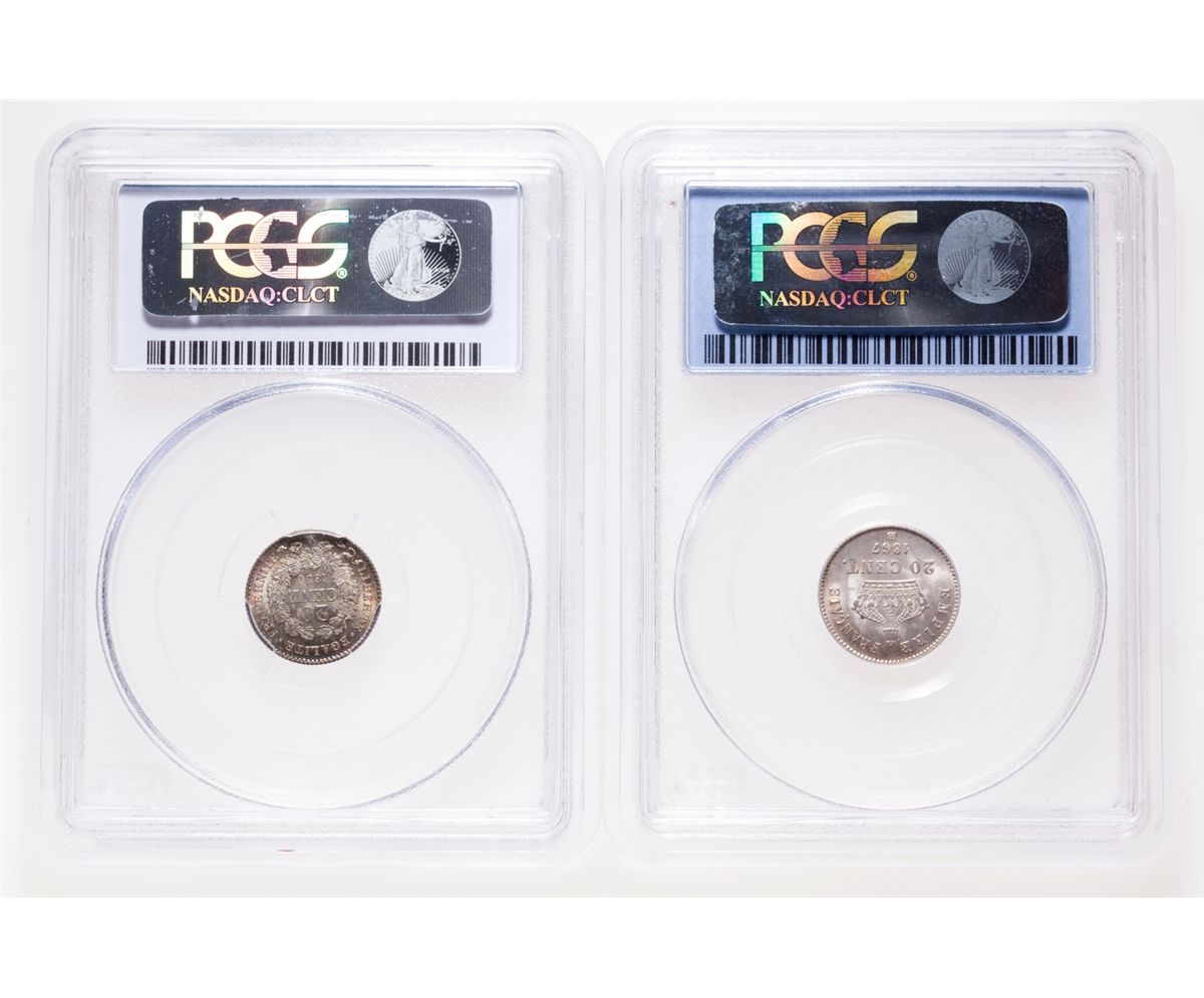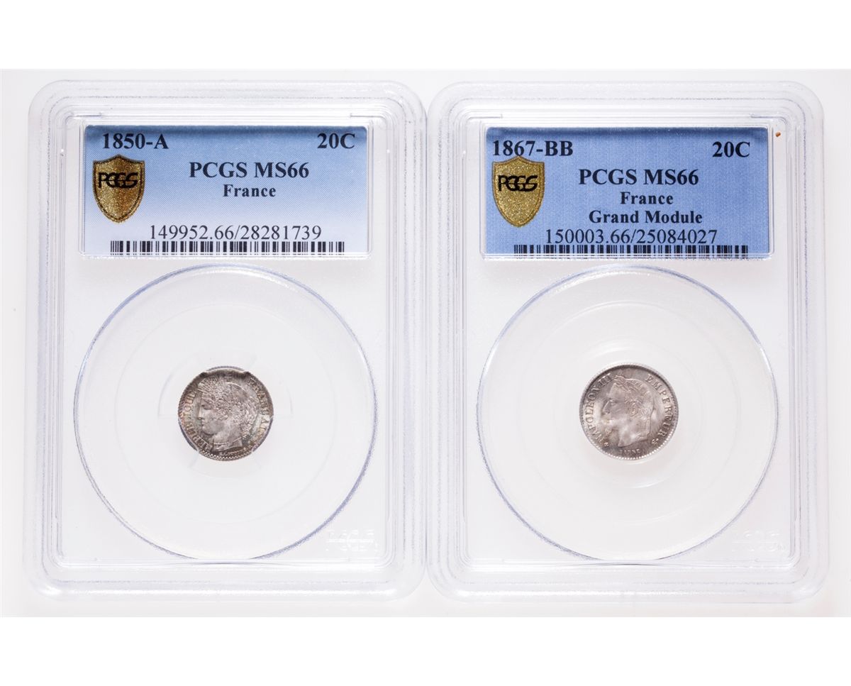 France. Lot of two (2) PCGS graded Gem Uncirculated MS-66 20 Centimes, 1850-A and 1867-BB.