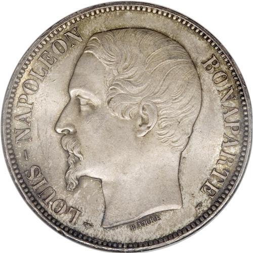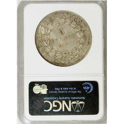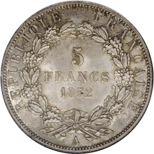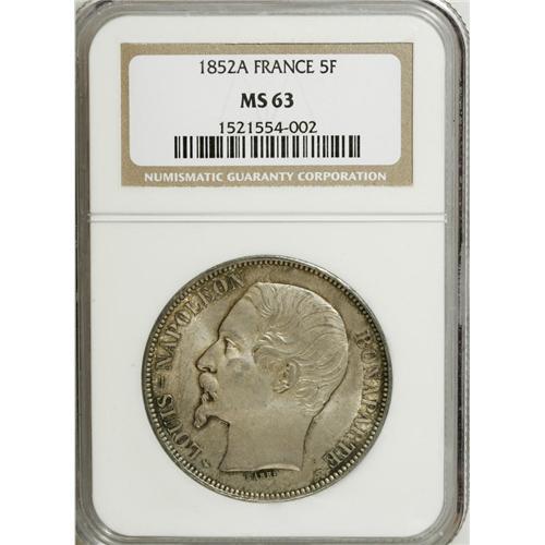 <B>Louis-Napoleon 5 Francs 1852A, </B></I>KM773.1, MS63 NGC, a choice original coin with light silvery gray patina.<BR><BR><b>Shipping:</b> Coins & Currency (<a target="_blank" href="http://www.heritageauctions.com/common/shipping.php">view shipping information</a>)