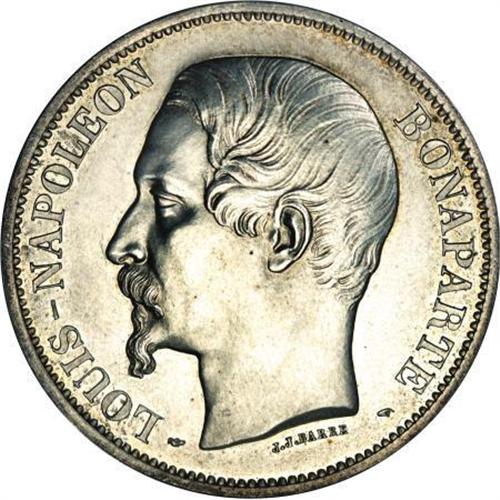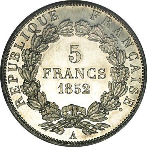 <B>Louis Napoleon Pattern Proof 5 Francs 1852-A,</B></I> Mazard 1218, plain edge, choice lightly toned Proof, faint hairlines. Extremely rare and highly desirable silver pattern.<BR><BR><b>Shipping:</b> Coins & Currency (<a target="_blank" href="http://www.heritageauctions.com/common/shipping.php">view shipping information</a>)