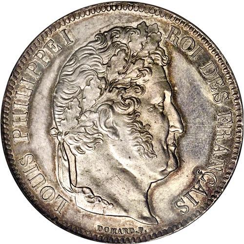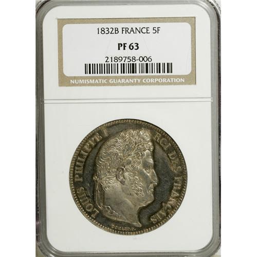 <B>Louis Philippe I 5 Francs 1832B, </B></I>KM749.2, Proof 63 NGC, a wonderful coin with sparkling surfaces, lightly frosted bust and lovely pewter gray and gold patina. Extremely rare as a Proof - the first we've seen.<BR><BR><b>Shipping:</b> Coins & Currency (<a target="_blank" href="http://www.heritageauctions.com/common/shipping.php">view shipping information</a>)