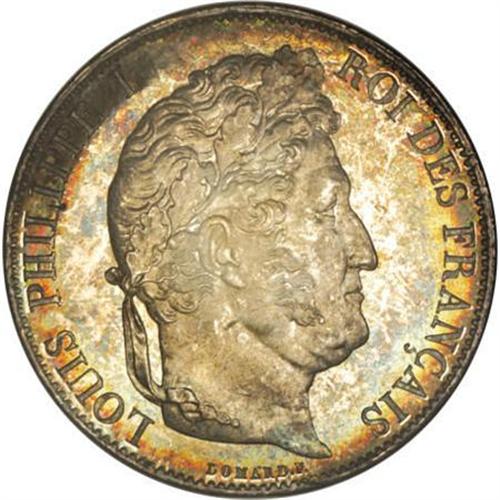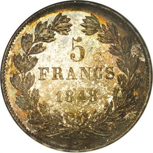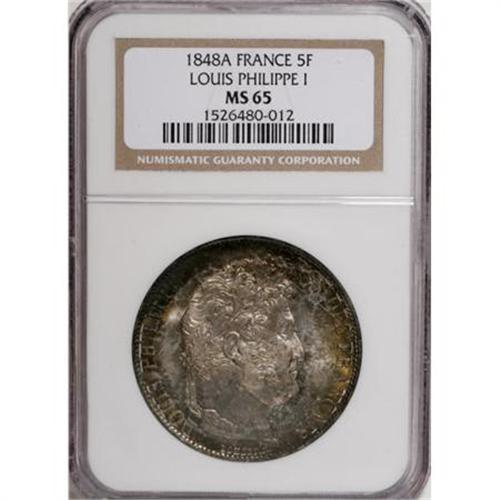 <B>Louis Philippe I 5 Francs 1848-A,</B></I> KM749.1, MS65 NGC, a gorgeous coin with flashy multi-hued patina and full underlying mint brilliance - a visual wonder. Rare and desirable in this select quality.<BR><BR><b>Shipping:</b> Coins & Currency (<a target="_blank" href="http://www.heritageauctions.com/common/shipping.php">view shipping information</a>)
