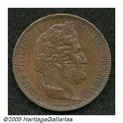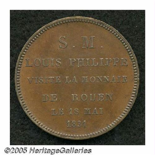 <B>Louis Philippe I 5 Francs Mint Visit 1831 in Copper, </B></I>glossy brown AU, issued for the visit of the King to the mint at Rouen on the 18th of May, 1831. Regrettably removed from the SCWC in order to make room for 50 pages of Korean cash coins by variety.