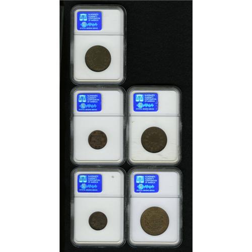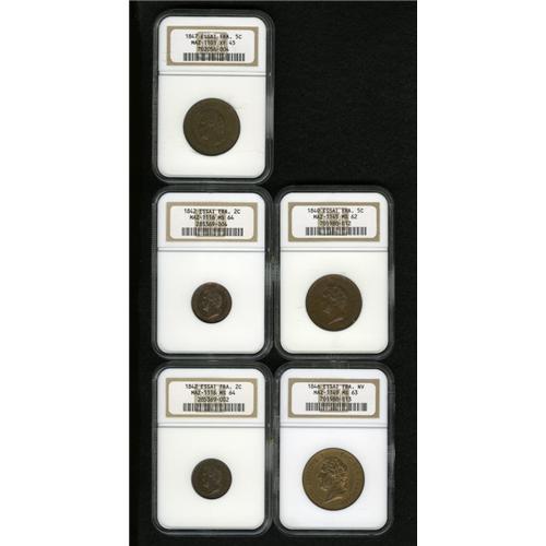 <B>Louis Philippe I - Quintet of NGC Graded Copper Patterns, </B></I>Mazard 1116 2 Centimes 1842 MS64 (2 pieces), Mazard 1145 5 Centimes 1840 MS62, Mazard 1101 5 Centimes 1847 XF45 and Mazard 1149 (10 Centimes) no value on coin 1846 MS63. An attractive group all with the portrait of the King.<BR><BR><b>Shipping:</b> Coins & Currency (<a target="_blank" href="http://www.heritageauctions.com/common/shipping.php">view shipping information</a>)