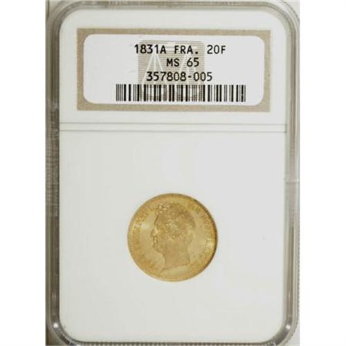 <B>Louis Philippe I gold 20 Francs 1831-A,</B></I> KM739.1 or 746.1, the edge lettering is not visible in the slab, nor is it mentioned on the slab. MS65 NGC, fully brilliant and exceptionally attractive for this type.<BR><BR><b>Shipping:</b> Coins & Currency (<a target="_blank" href="http://www.heritageauctions.com/common/shipping.php">view shipping information</a>)