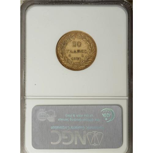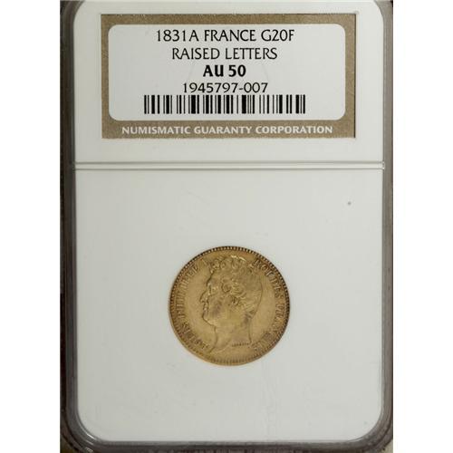 <B>Louis Philippe I gold 20 Francs 1831A Raised Letters, </B></I>KM746.1, AU50 NGC, slight trace of luster in the legends.<BR><I>From the Marrero Family Collection.</B></I><BR><BR><b>Shipping:</b> Coins & Currency (<a target="_blank" href="http://www.heritageauctions.com/common/shipping.php">view shipping information</a>)