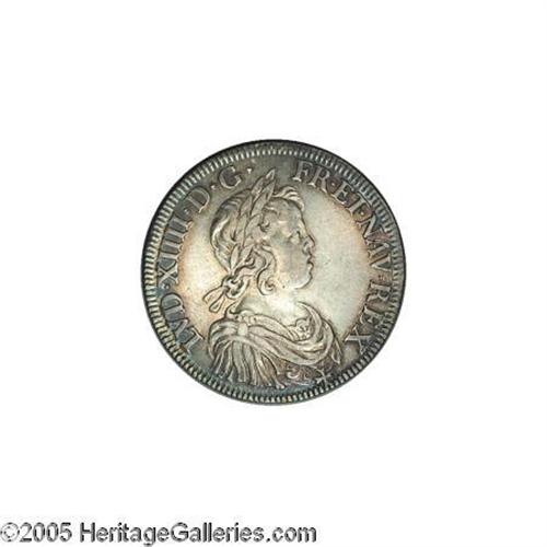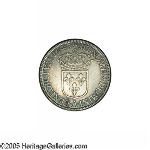 <B>Louis XIIII Ecu 1643A, </B></I>KM144.1, short curl, choice toned AXF, beautiful old-time toning and great eye appeal. Rare this nice!