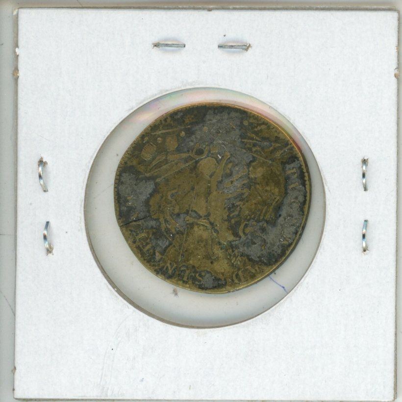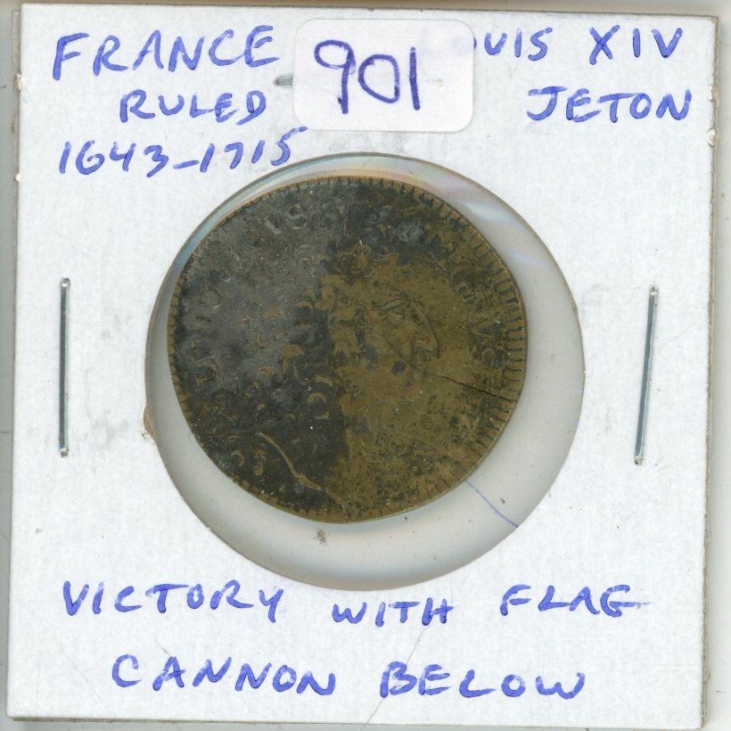 France. Louis XIV Jeton. The king ruled from 1643 – 1715. Rev: Victory with flag, cannon below. VF.