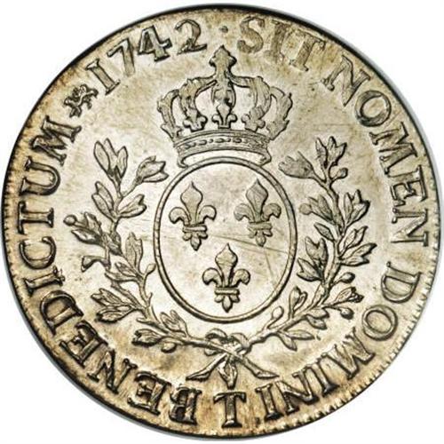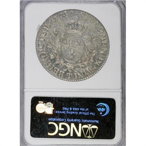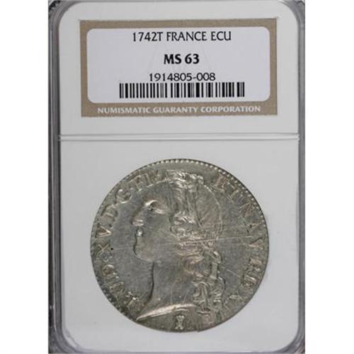 <B>Louis XV Ecu 1742T,</B></I> KM512.20, MS63 NGC, fully lustrous and remarkably sharp, a premium example of this type despite some faint adjustment marks, primarily on the rim. One of the nicer specimens of this type that we have seen.<BR><BR><b>Shipping:</b> Coins & Currency (<a target="_blank" href="http://www.heritageauctions.com/common/shipping.php">view shipping information</a>)