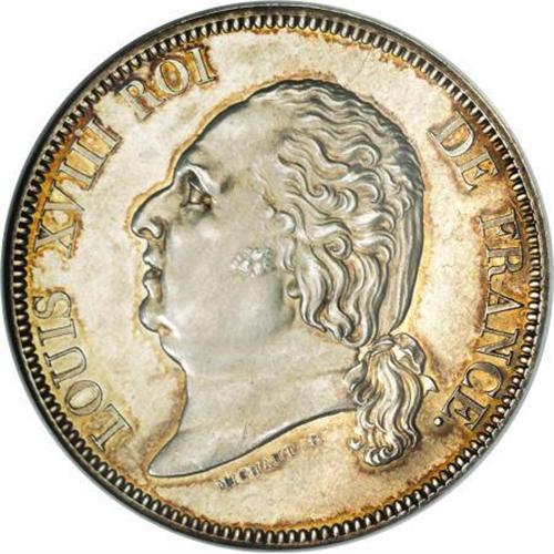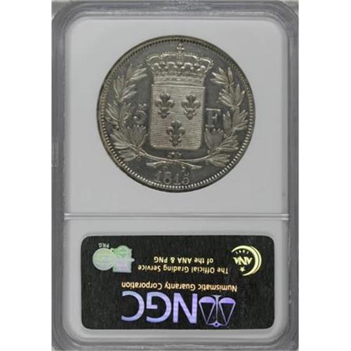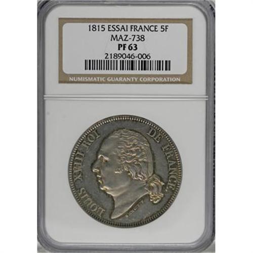 <B>Louis XVIII Silver Pattern 5 Francs 1815,</B></I> Mazard 738, Proof 63 NGC, a fabulous example with shimmering mirror surfaces and attractive golden patina. Extremely rare Essai for KM711.<BR><BR><b>Shipping:</b> Coins & Currency (<a target="_blank" href="http://www.heritageauctions.com/common/shipping.php">view shipping information</a>)