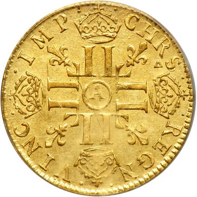 France. Louis d'or, 1649-A (Paris). Fr-415; KM-157.1. Louis XIV, 1643-1715. Child head with short curl. Reverse: Four cruciform crowned double L's, fleu de lis in angles. PCGS graded AU-55.
