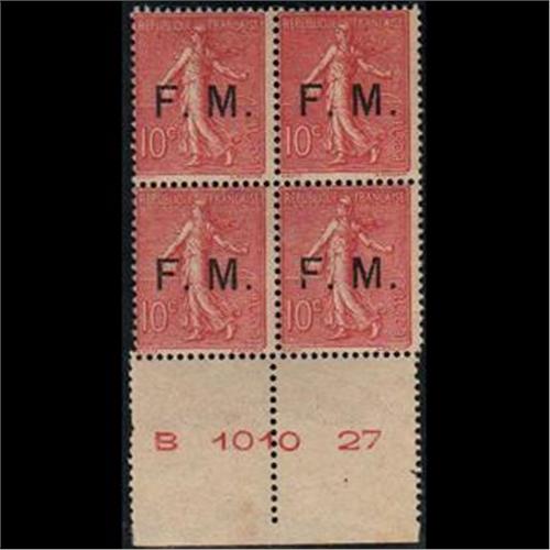 France #M4 F-VF-LH **FRANCHISE MILITAIRE BLOCK OF 4 WITH INSCRIPTION B 1010 27**, gum is disturb, CAT-440EUROS