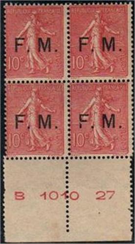 France #M4 F-VF-LH **FRANCHISE MILITAIRE BLOCK OF 4 WITH INSCRIPTION B 1010 27**, gum is disturb, CAT-440EUROS<Br>*** ITEM HAS NO FAULTS***