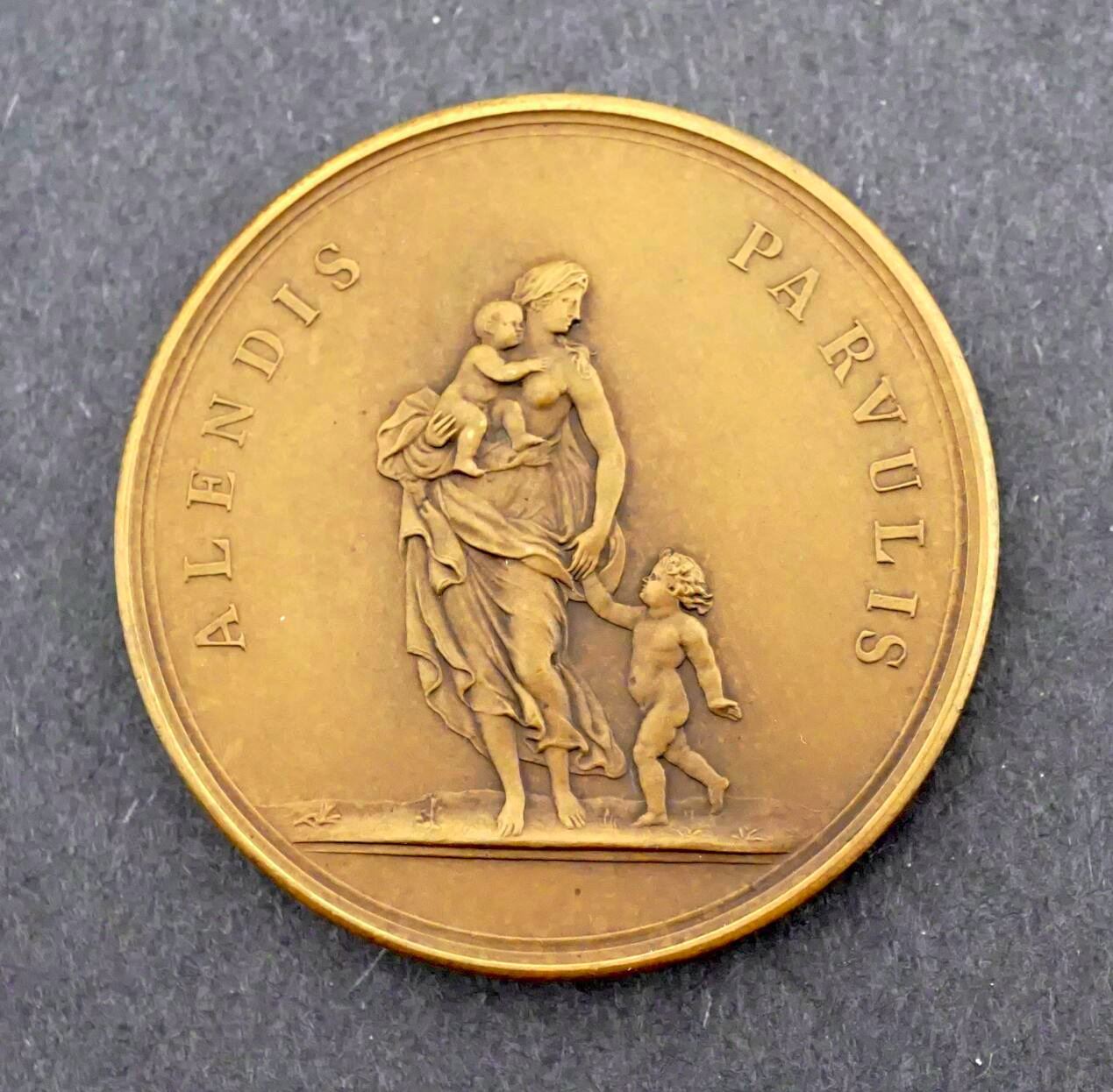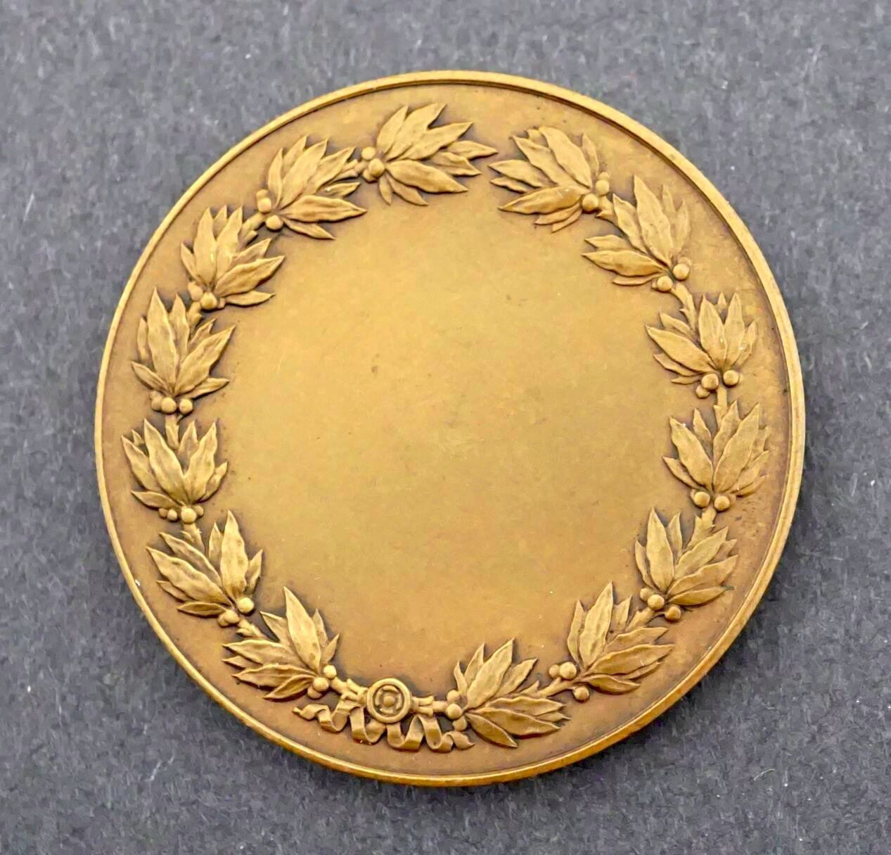 Paris Mint "BRONZE" stamp on edge. Obverse depicts a thin woman holding a small child. With an older child in hand. Reverse is a wreath, with an uninscribed center. Measures 50 mm and weighs 66.1 grams.