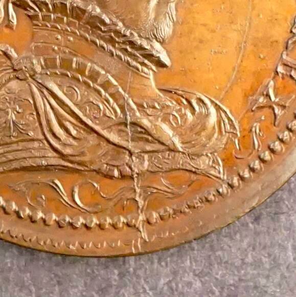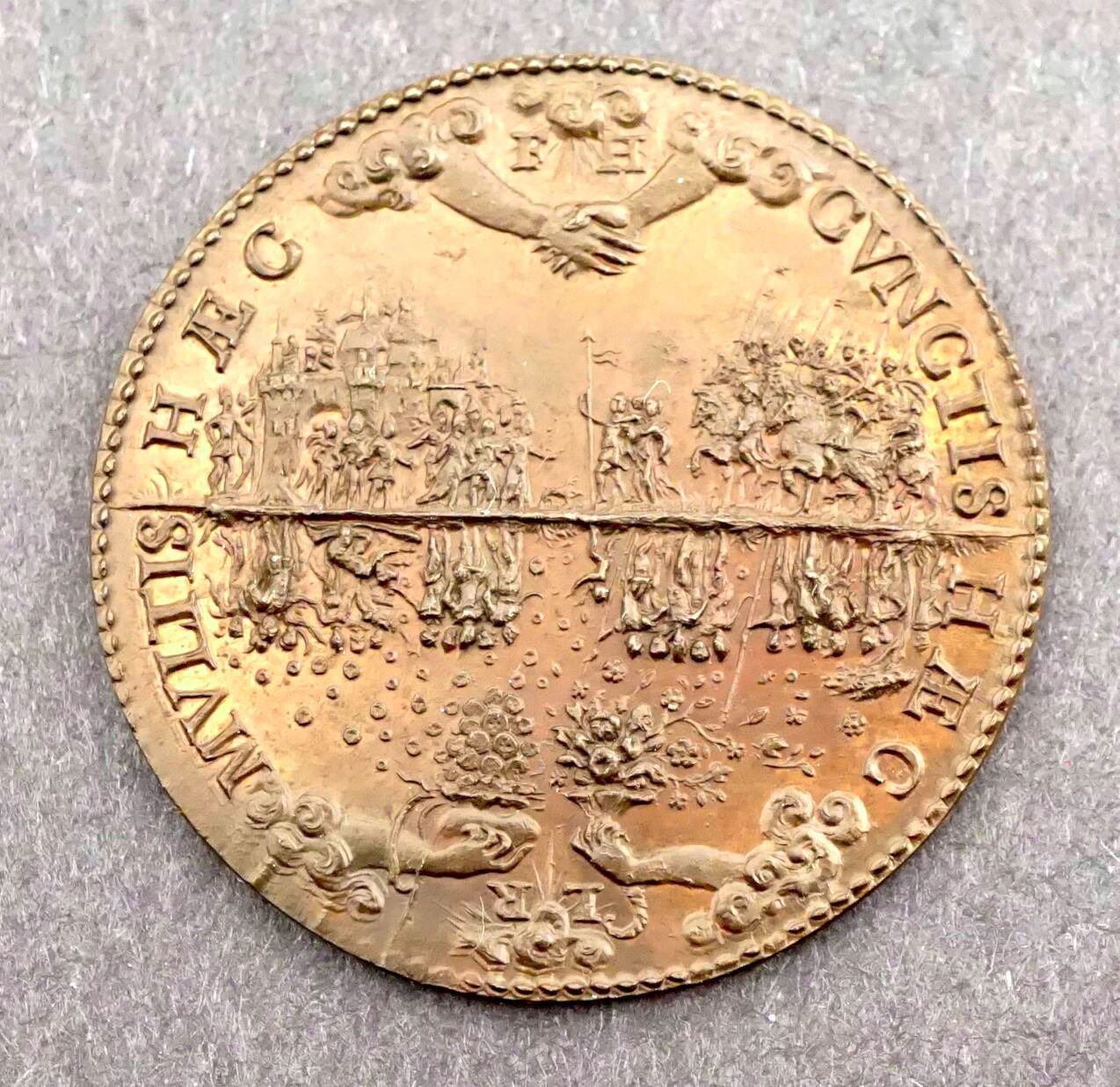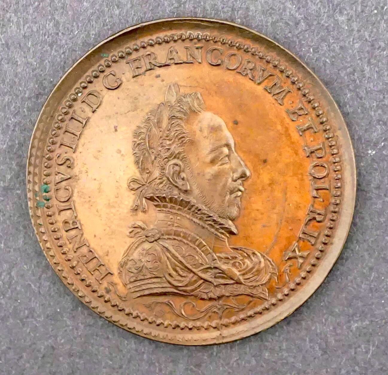 46 mm, 29 grams. HENRICUS 111 D.G. FRANCORUN et POL. REX Laureate Bust right. Reverse: HAEC CUNETIS HAEC MULTIS (more or less: This is as much as many) a scene of cavalry entering a town… a heavy line below, and the above scene mirrored, reversed below. While perhaps not contemporary to Henry's reign (1574-1589), this piece, by it's fabric, does appear to have considerable age. Condition is very nearly new. some spotting