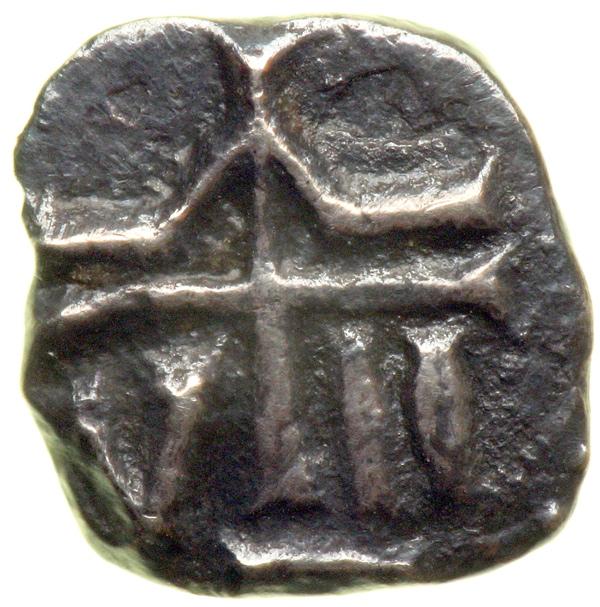 France - Merovingian. Silver Denier. Marseille. 1.165 grams. Belfort-3037; Roberts-96. Obverse: Image of a face with cross in center with pellet in each angle. Reverse: Horizontal line with triangle over cross, step below, V and II in the third and fourth angles of the cross. Very Fine.