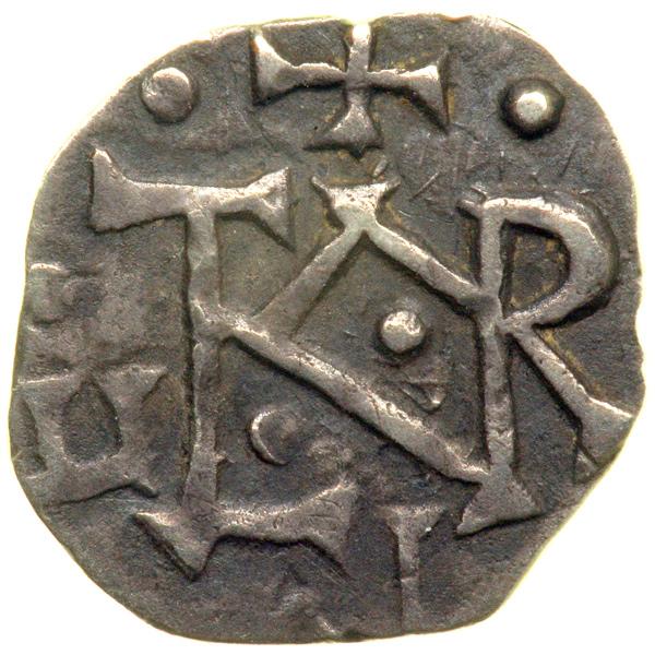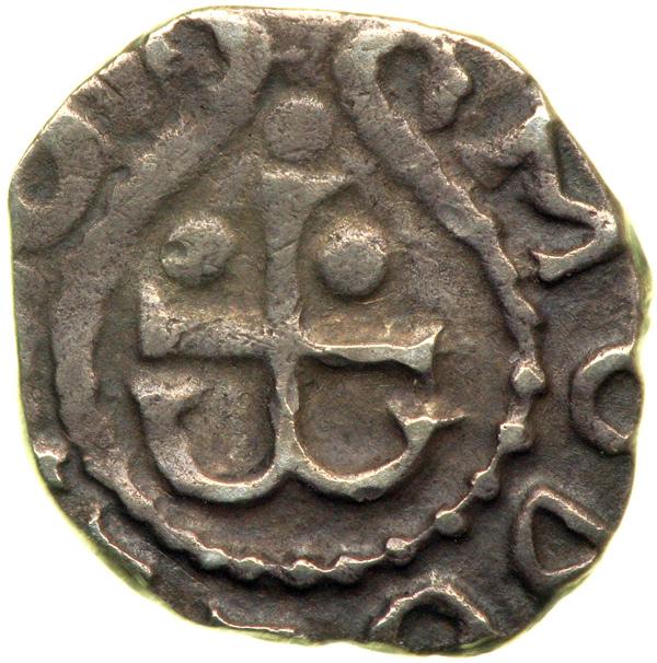 France - Merovingian. Silver Denier. Roberts-279; Belfort-6652 (this coin); Prou-822 similar reverse. 0.99 grams. Possibly Paris mint -Cross and anchor closely associated with Paris. Obverse: Said to be "CR" monogram. Cross at top with pellets at sides. Reverse: Cross Ancree (cross and anchor), horizontal cross bar. Unreadable legend. Rare. Very Fine.