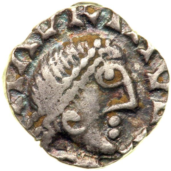 France - Merovingians. Silver Denier. 1.195 Grams. Orleans mint. Moneyer Maurinus. C. Bais. 75 (only two different specimens by the moneyer Maurinus); Belfort- Unlisted; Roberts-Unlisted; MEC-Unlisted. Obverse. Diademed bust right. Legend + MAVRINVS M. Reverse: Cross chrismee on three steps, pellet right. Legend + AVRILIANIS. Well struck with nice color and a strong portrait. Rare. Choice Very Fine.