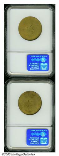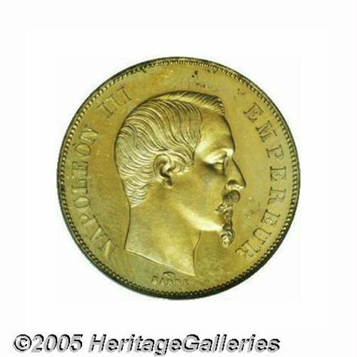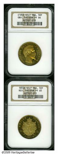 <B>Napoleon III 50 Francs Pattern Pair, </B></I>uniface strikings of the 50 Francs 1855-A in gilt bronze, listed by KM as trial strikes, KM-TS11 and TS12, both certified by NGC, the obverse as Proof 64 and the reverse as Proof 65. Rarely seen in the market, and a handsome pair!