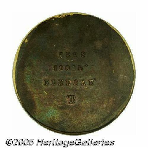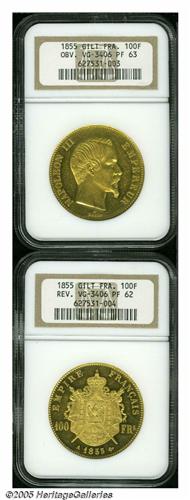 <B>Napoleon III Pattern 100 Francs - Pair, </B></I>uniface strikings of the 1855-A 100 Francs in gilt bronze, listed by KM as trial strikes, KM-TS13 and TS14. Both are certified by NGC, the obverse as Proof 63 and the reverse Proof 62. A rare pair.