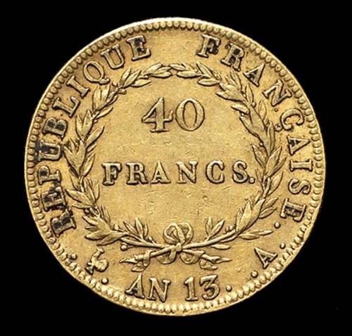 Francia - Napoleone I Imperatore (1804-1815) - 40 Franchi anno 13 - Zecca: Parigi - Diritto: effigie di Napoleone a sinistra - Rovescio: valore entro corona di alloro -