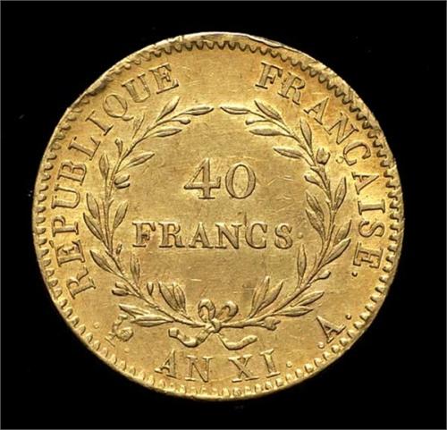 Francia - Napoleone Primo Console (1801-1804) - 40 Franchi anno XI - Zecca: Parigi - Diritto: Effigie di Napoleone a sinistra - Rovescio: valore entro corona di alloro - Colpetti sul bordo del rovescio - Di buona qualità