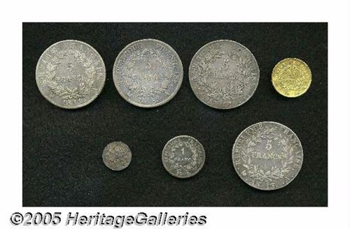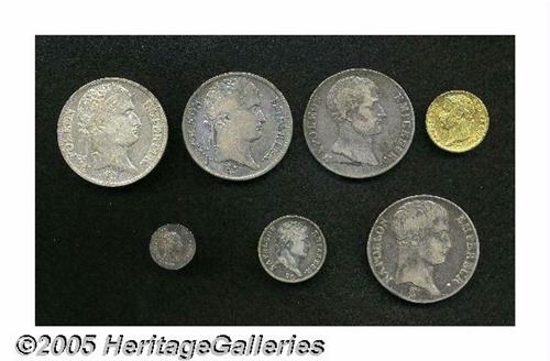 <B>Napoleonic Gold and Silver Selection, </B></I>KM695.1 gold 20 Francs 1813-A, VF, KM660.6 5 Francs L'An 12-K, toned F-VF and scarce, KM662.1 5 Francs L'An 13-A, nice F+, KM686.1 5 Francs 1808-A, Fine, KM694.1 5 Francs 1811-A, VF+, KM682.14 Franc 1808-W, F+, and KM654.1 1/4 Franc L'An 12-A, deeply toned VF-XF, very scarce in this attractive grade. <B>Sold as is, no return lot.</B></I>