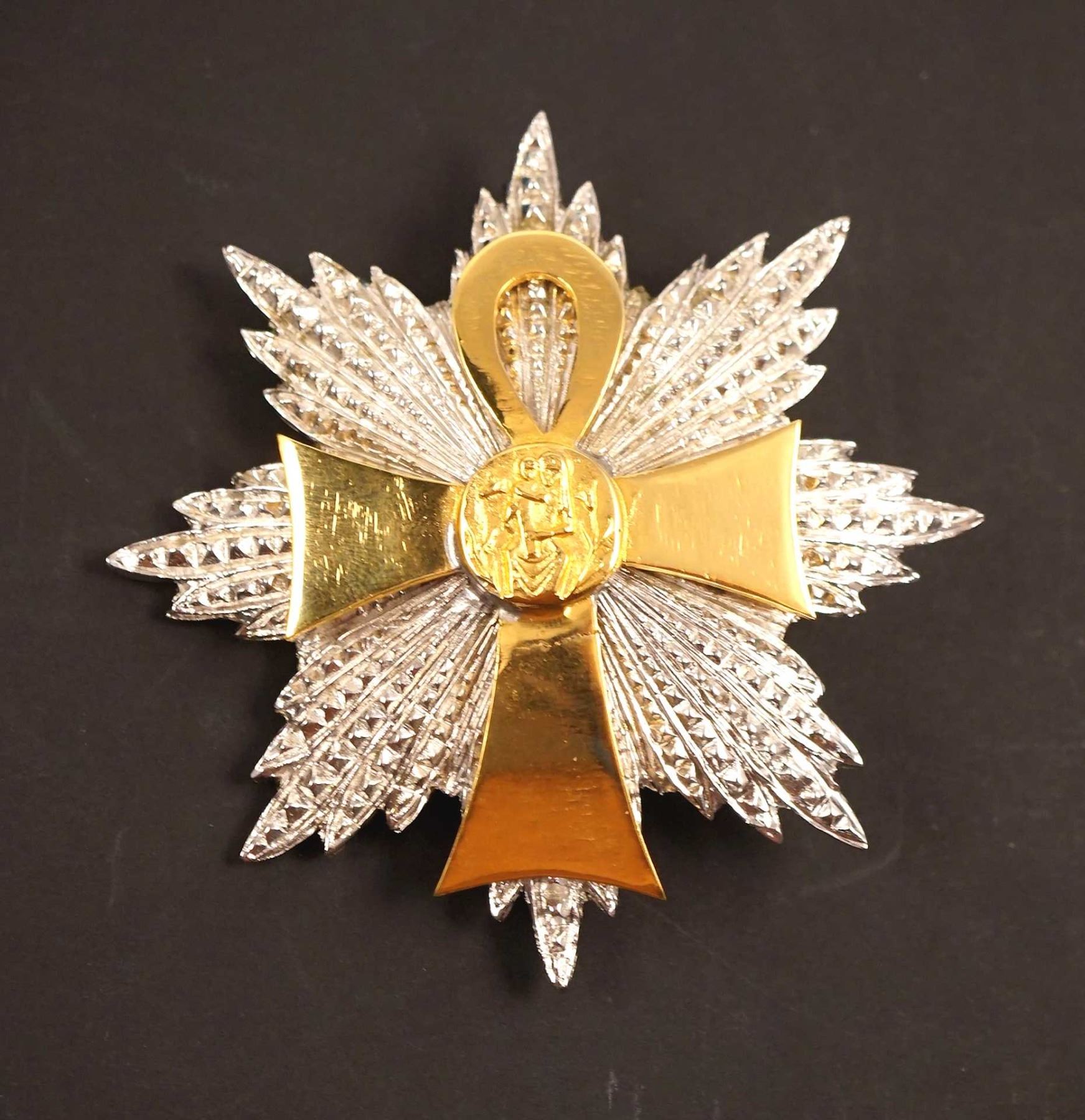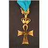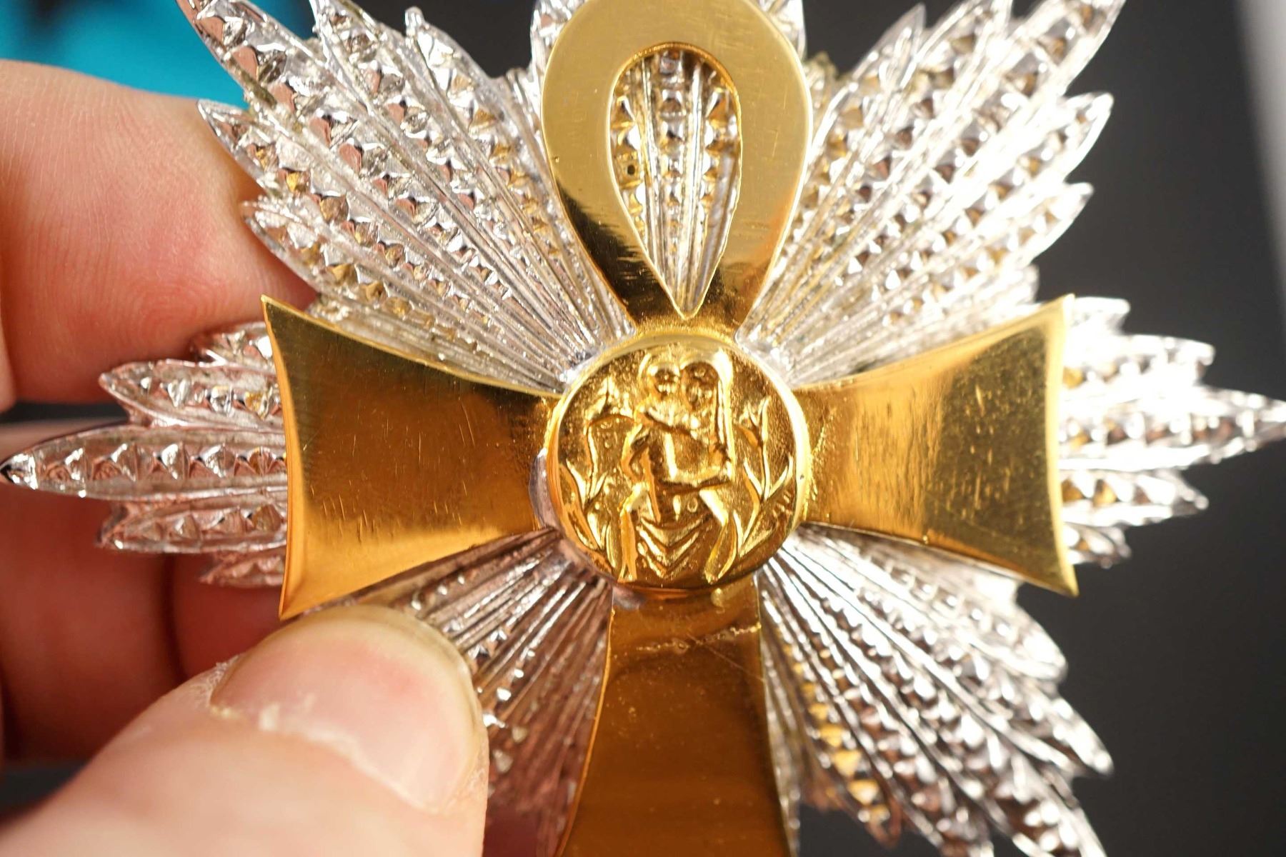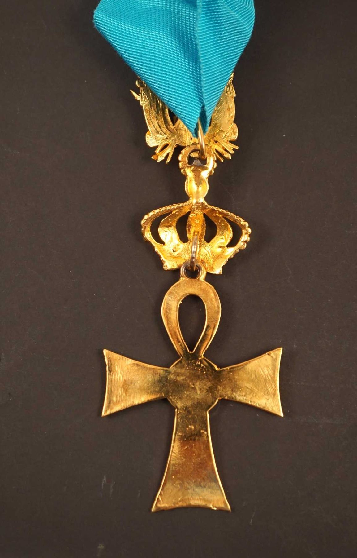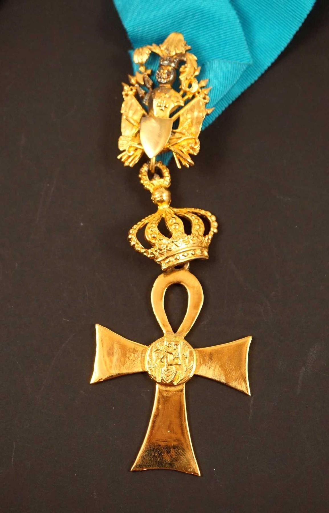 Mounted on a 60 mm. gold Anhk, a 16 mm.gold disc with haloed woman and child with orchids, suspended from 35 mm. gold crown that is suspended from 47 x 30 mm armour and flags. Comes with light Blue neck ribbon & an 85 x 85 mm. 74.26 gms. Breast star with the same cross. EF.