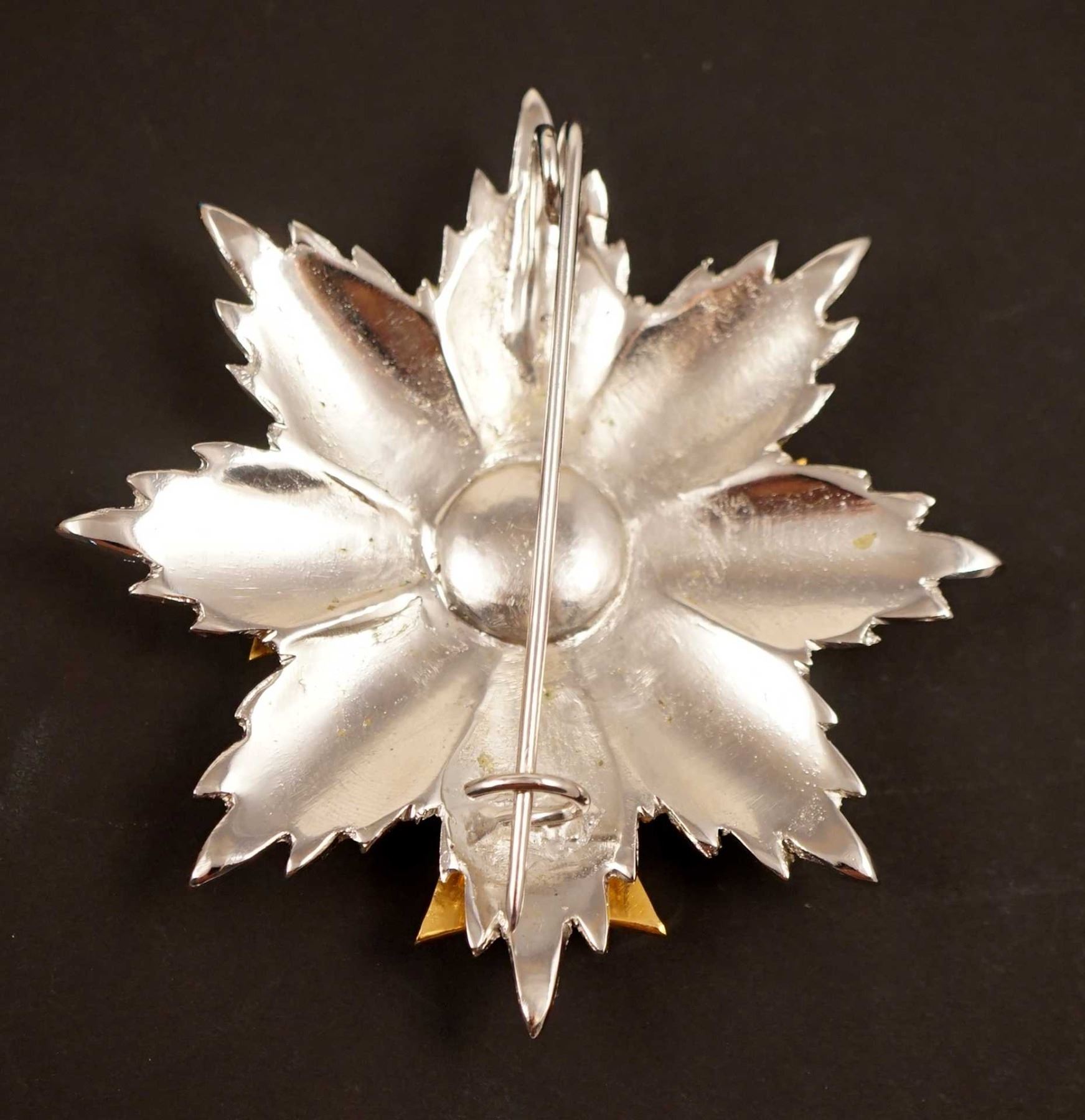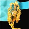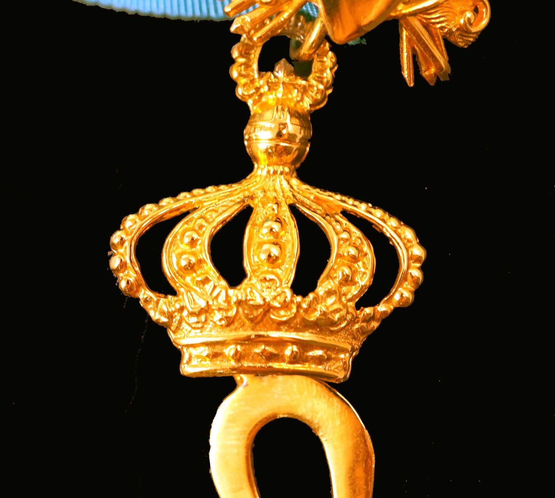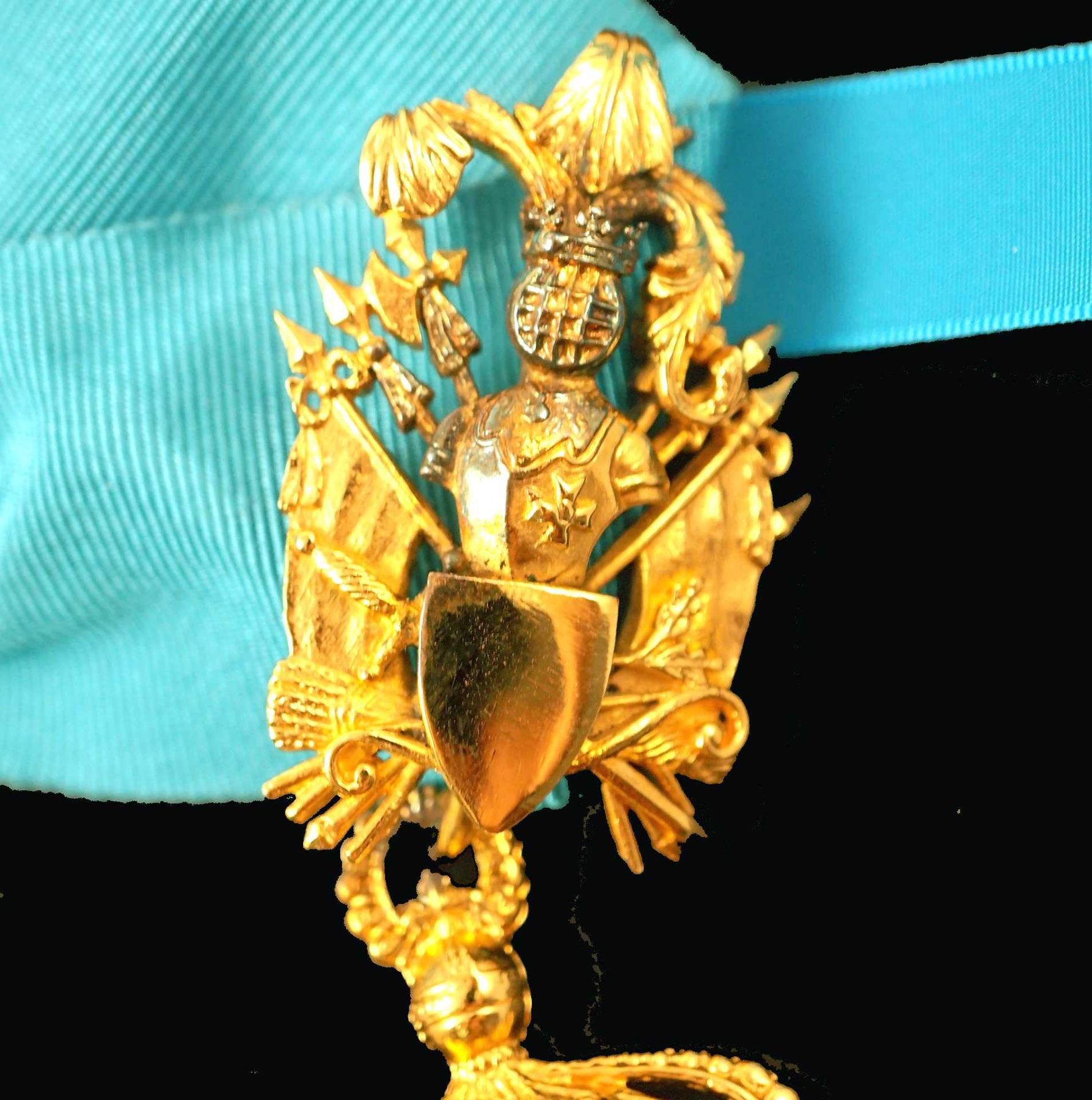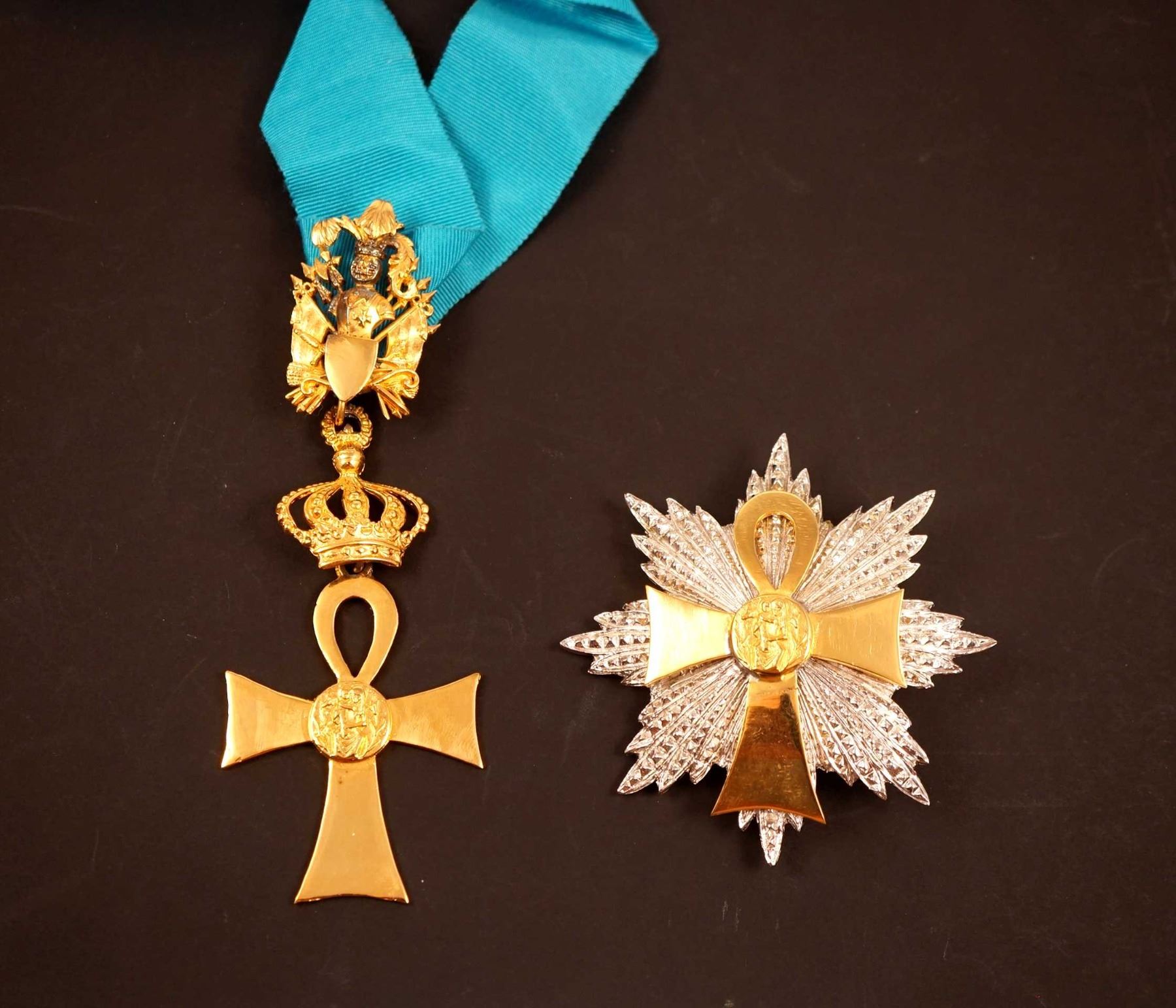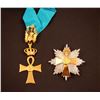 Mounted on a 60 mm. gold Anhk, a 16 mm.gold disc with haloed woman and child with orchids, suspended from 35 mm. gold crown that is suspended from 47 x 30 mm armour and flags. Comes with light Blue neck ribbon & an 85 x 85 mm. 74.26 gms. Breast star with the same cross. EF.