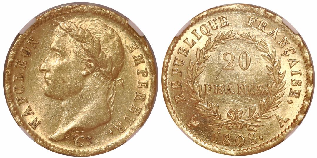 France (Paris mint), 20 francs, 1808-A, encapsulated NGC MS 62. KM-687.1. Good luster, light yellow color, minor bagmarks only.