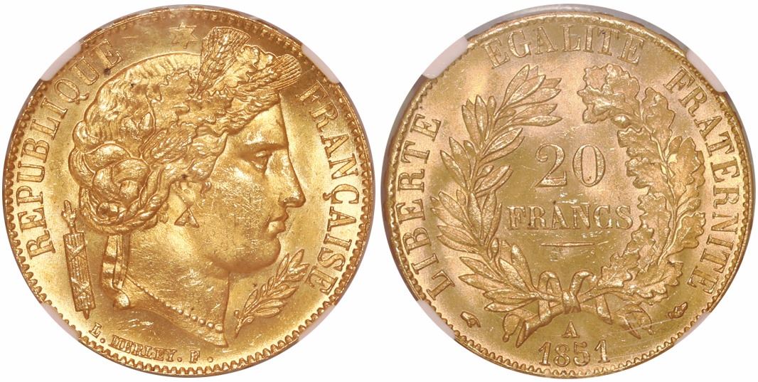 France (Paris mint), 20 francs, 1851-A, encapsulated NGC MS 64.