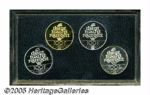 <B>Republic 100 Franc 1987 Lafayette Set, </B></I>KM962a-d, four Gem Proof coins in Silver, Palladium, Gold and Platinum, and presented in the official Monnaie de Paris plastic case.