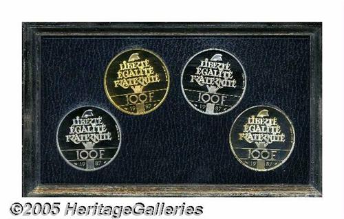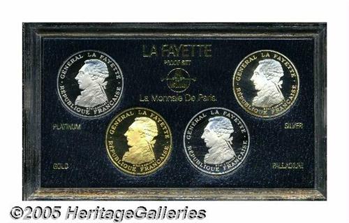 <B>Republic 100 Francs 1987 Lafayette Set, </B></I>KM962a-d, four Gem Proofs in Silver, Palladium, Gold and Platinum, housed in the Monnaie de Paris plastic holder within a presentation case with descriptive card.