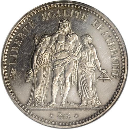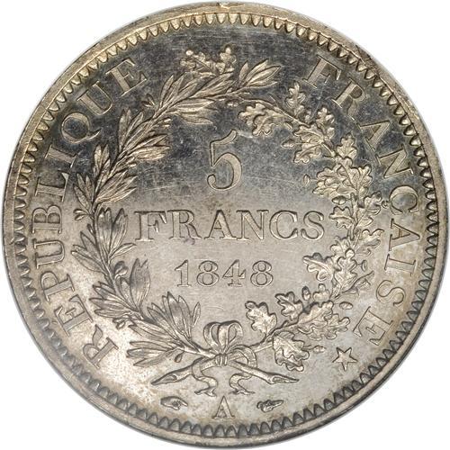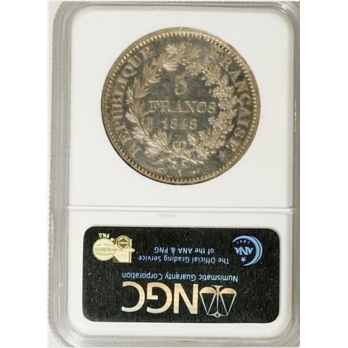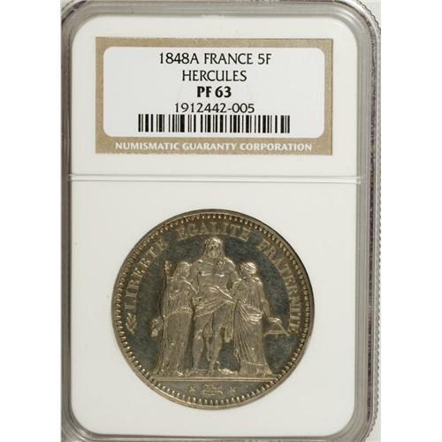 <B>Republic 5 Francs 1848A, </B></I>KM756.1, Proof 63 NGC, lightly toned with exceptionally sharp details.<BR><BR><b>Shipping:</b> Coins & Currency (<a target="_blank" href="http://www.heritageauctions.com/common/shipping.php">view shipping information</a>)