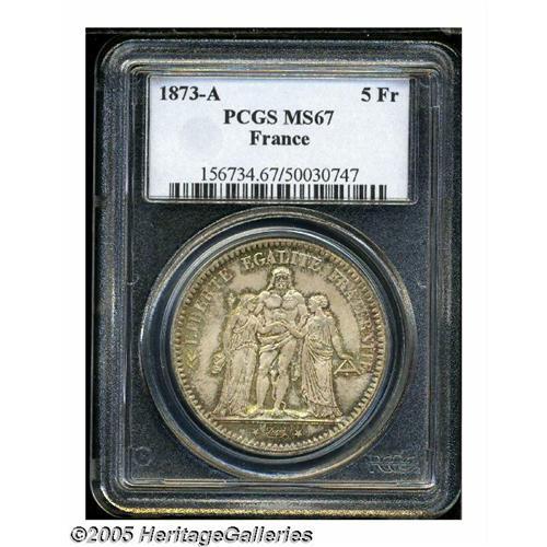 <B>Republic 5 Francs 1873A, </B></I>KM820.1, MS67 PCGS, an incredible coin with lovely sea green to gold patina. Scarce graded this high!