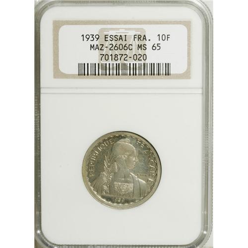 <B>Republic - Essais and Pieforts, </B></I>Mazard 2606C 10 Francs 1939 Copper-Nickel, MS65 NGC, Mazard 2745 20 Francs 1945 Copper-Nickel, MS62 NGC and KM-P641 2 Francs 1979 Silver Piefort, Proof 65 NGC.<BR><BR><b>Shipping:</b> Coins & Currency (<a target="_blank" href="http://www.heritageauctions.com/common/shipping.php">view shipping information</a>)
