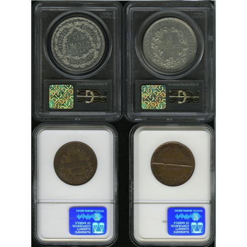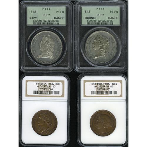 <B>Republic - Quartet of Patterns Dated 1848, </B></I>KM-PnC47 10 Centimes Copper, MS63 NGC, Mazard 1357 Decime Copper, Proof 64 NGC, KM-Pn49 5 Francs in white metal, bust by Tournier, Proof 62 PCGS, and KM-Pn51 5 Francs in white metal, bust by Bovy, Proof 62 PCGS. An interesting selection of these creative new designs for the rebirth of the French Republic.<BR><BR><b>Shipping:</b> Coins & Currency (<a target="_blank" href="http://www.heritageauctions.com/common/shipping.php">view shipping information</a>)
