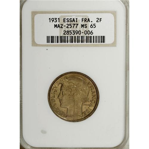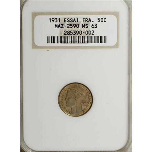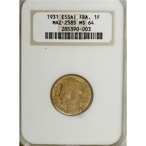 <B>Republic Set of Three 1931 Essais, </B></I>Mazard 2590, KM-EA64, 50 Centimes MS63 NGC, Mazard 2585, KM-EB64, Franc MS64 NGC and Mazard 2577, KM-E64, 2 Francs MS65 NGC. All are nice examples with no spots and full mint luster.<BR><BR><b>Shipping:</b> Coins & Currency (<a target="_blank" href="http://www.heritageauctions.com/common/shipping.php">view shipping information</a>)