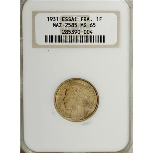 <B>Republic - Trio of 20th Century Patterns (Essais), </B></I>Mazard 2135A, KME-A39, 25 Centimes 1904, MS65 NGC, Mazard 2590, KME-A64, 50 Centimes 1931, MS63 NGC and Mazard 2585, KME-B64, Franc 1931, MS65 NGC.<BR><BR><b>Shipping:</b> Coins & Currency (<a target="_blank" href="http://www.heritageauctions.com/common/shipping.php">view shipping information</a>)