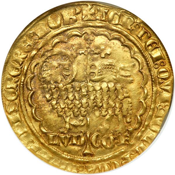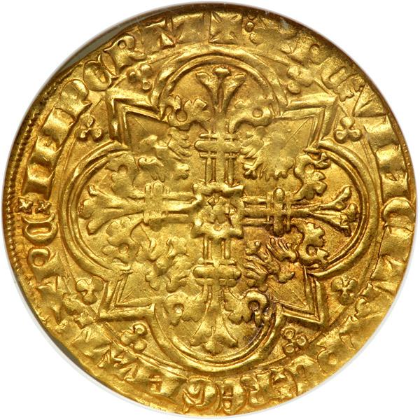 France - Rethel. 1 Mouton d'or, ND. Fr-224. Louis III De Male, 1346-1384. Pascal lamb in circle of arches, cruciform staff with pennant behind. Reverse: Floriated cross in angled quatrefoil, eagles in angles. (catalog value in Friedberg $5,000 in XF). NGC graded AU-55.