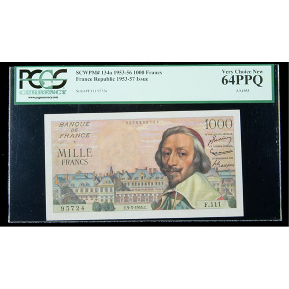 France SCWPM# 134a, 3.3.1955 1000 Francs. PCGS Very Choice New 64PPQ. . Fr-P-134a. This lovely near-Gem is pleasing in every respect, and only some very minor counting crinkles limit the grade.