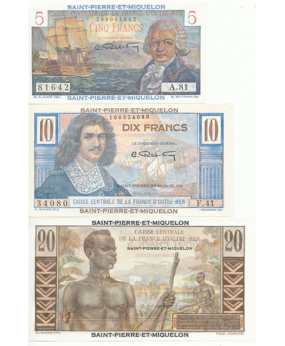 France; Saint-Pierre-Et -Miquelon issue notes. Includes 5 Franc, 10 Franc and 20 Franc all AU to UNC