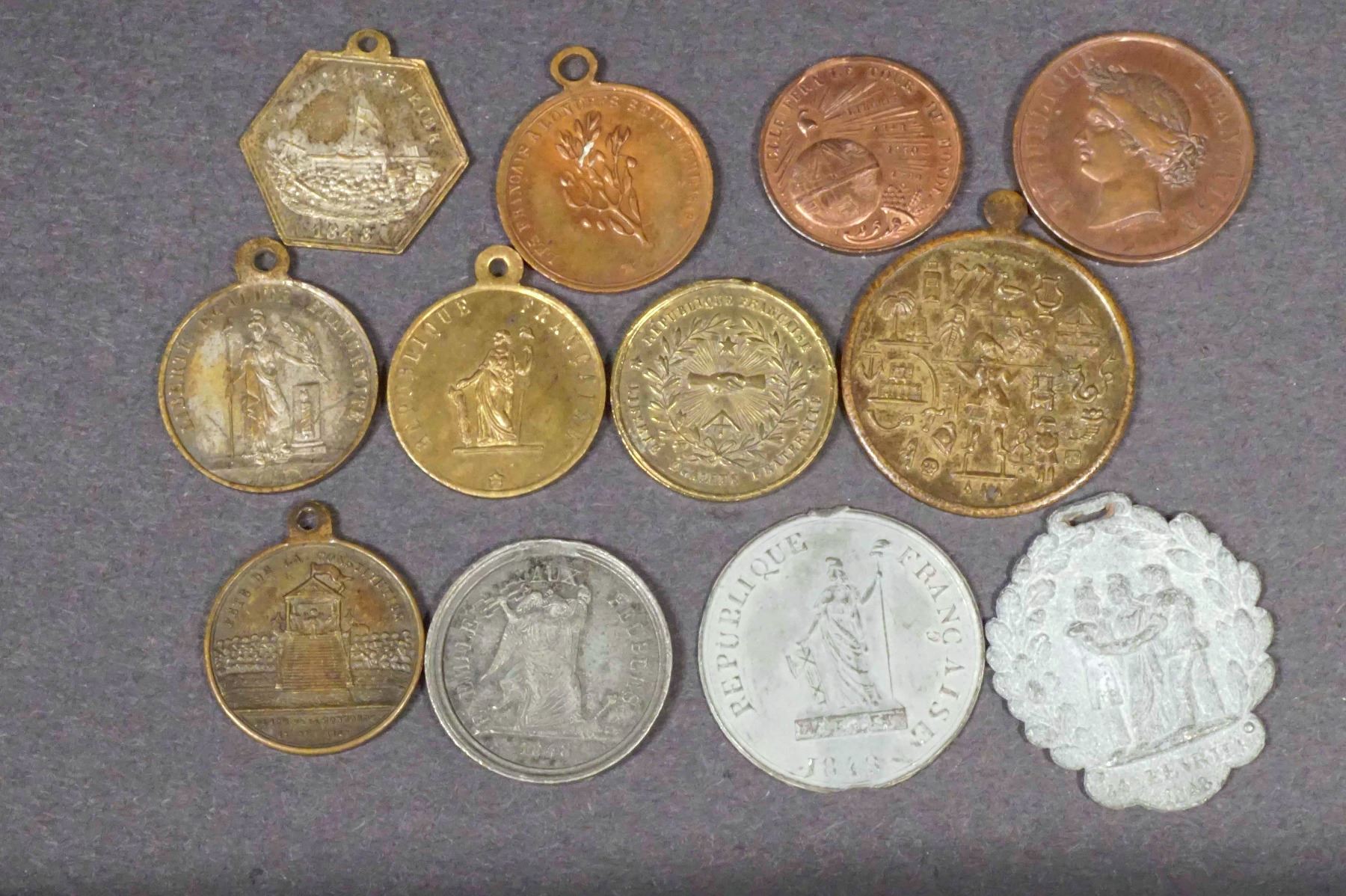 A fascinating lot, including many scarce to rare pieces. 11 are Republican, the largest one is satirical. Six are looped for suspension. 4-5 are in Uncirculated condition, with considerable lustre. Two seem to be in tin, with serious deterioration of the metal.Pieces vary from 21-31mm, and are in copper, brass, white metal, silver or silver plate, tin.Together they make an interesting study of this little known and short-lived period in French history.