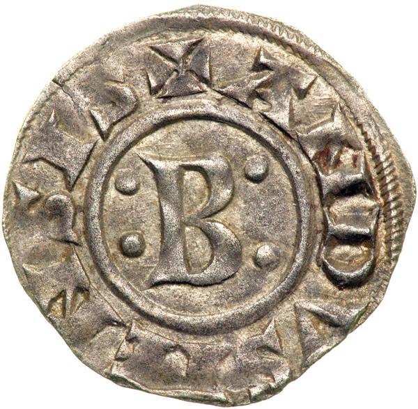 France. Seigniory of Anduse and Sauve. Denier. Roberts-4014; PdA-3852. Weight 0.822 grams. Bernard (I' Aine) II, 1145-1164. Obverse: B between four pellets. Leg: +ANDVSIENSIS. Reverse: Cross moline with one pellet in the first angle. Leg: + SALVIENSIS. Extremely Fine.