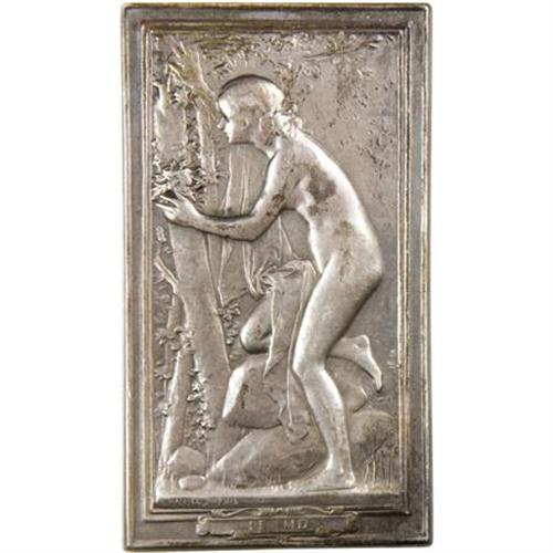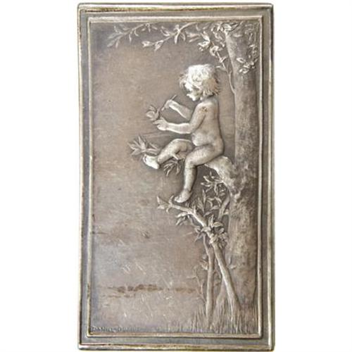 <B>Trio of French Silver and Bronze Plaques, Circa 1920.</B></I> Three plaques. A <B>silver plaque, </B></I>37 mm x 66 mm, (<I>argent</B></I> edge-stamped) featuring a young nude in the forest. The plaque is titled <I>Le Nid</B></I> and the reverse has a little cherub on a tree branch. The work is by Daniel Dupuis. A <B>second silver plaque, </B></I>50 mm x 64 mm (<I>argent</B></I> edge-stamped), with a young boy and an older man kneeling and looking skyward on the obverse. The reverse features this verse: "Quand Tout Change Pour Toi/La Nature Est La Meme/ Et Le Meme Soleil/Se Leve Sur Jour." ("When everything changes around you/Nature is the same/and the same sun/rises in the morning.) The final piece is a <B>small bronze plaque, </B></I>31 mm x 44 mm, featuring a young man holding leaves, engraved below A.S.V.D. 98 16.10. 21 2 Jun Brust.<BR><BR><b>Shipping:</b> Coins & Currency (<a target="_blank" href="http://www.heritageauctions.com/common/shipping.php">view shipping information</a>)