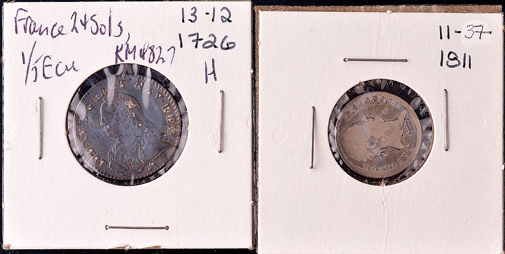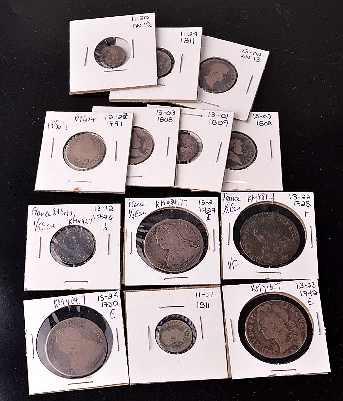 France, Louis XV, 24 Sols, 1/5 Ecu, 1726H, KM#482.7, VF details, creased; 1/2 Ecu, 1727, mm back to back C's, KM484.27, VG; 1728H, KM484.9, VF; 1730E, KM484.7, Good; 1742E, KM516.7, VG; Louis XVI, 15 Sols, 1791, KM604, AG; Napoleon, Quarter Franc, L'An 12A, KM653.1, F, glue remnants; Half Franc, 1809A; 1811A; KM691.1; 1811B, KM691.2; all VG; Franc, L'An13, KM656; 1808A, KM692.1; All 3 fair; Total of 13 coins