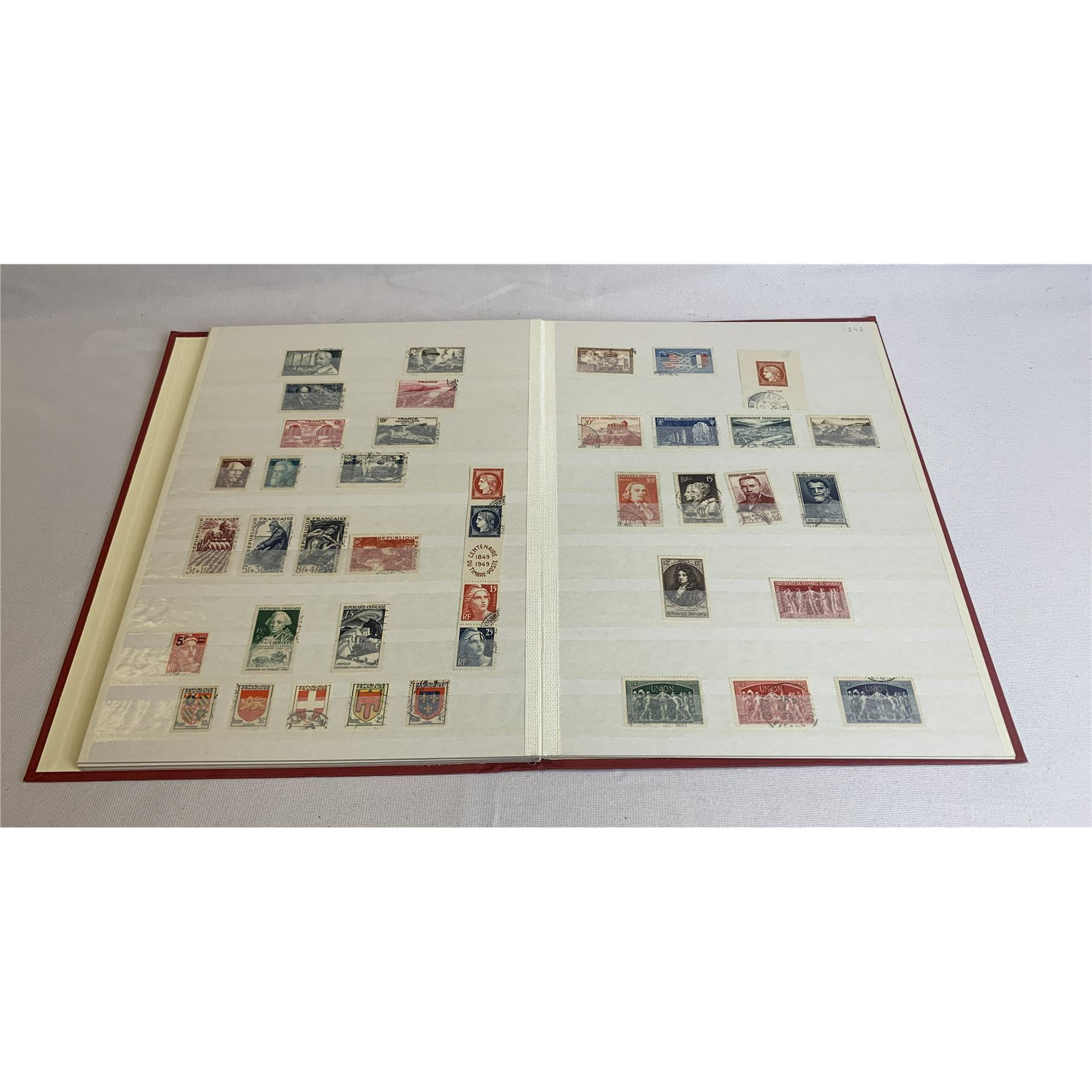 France stamp collection. This collection contains over 400 stamps, on 10 double-sided sheets both mint and cancelled. This collection is housed in a red stock album. Please see photos.